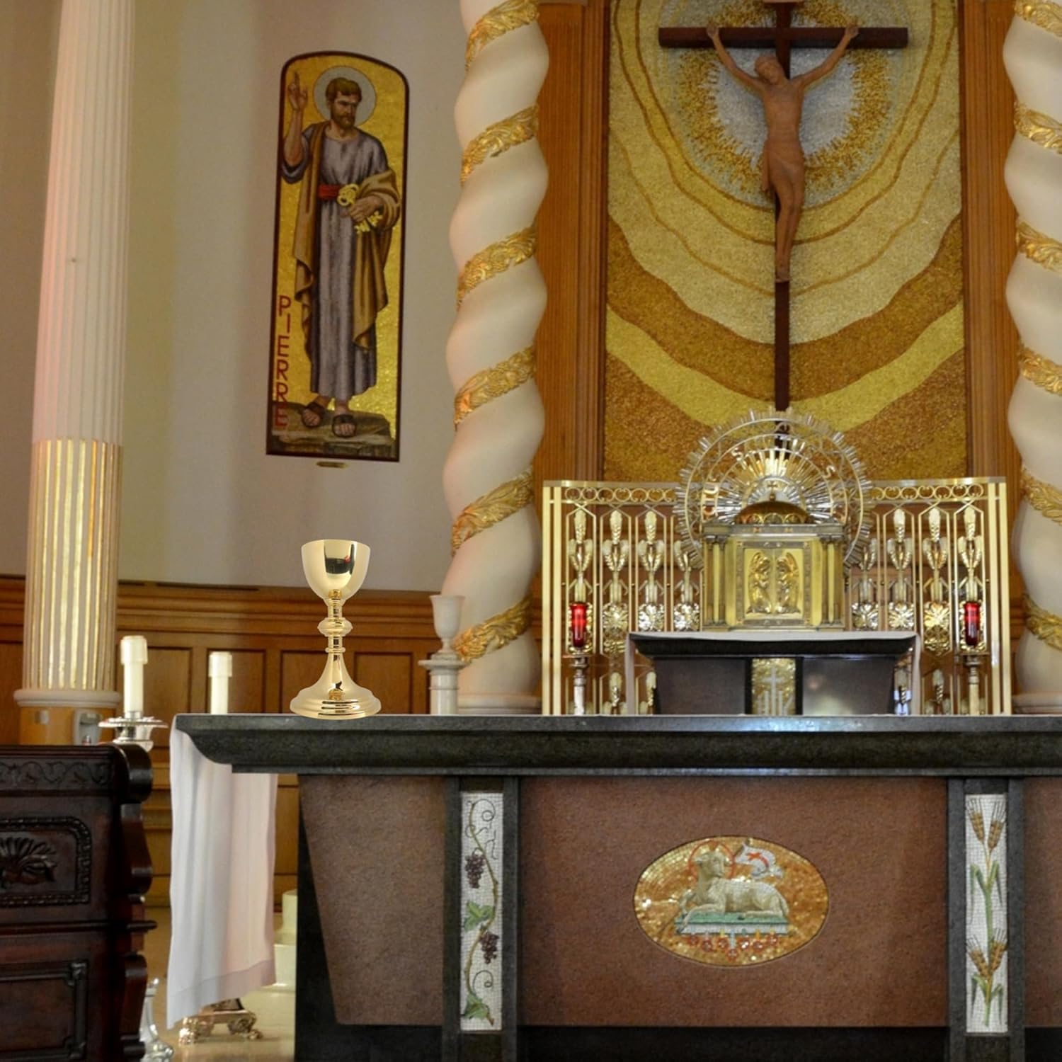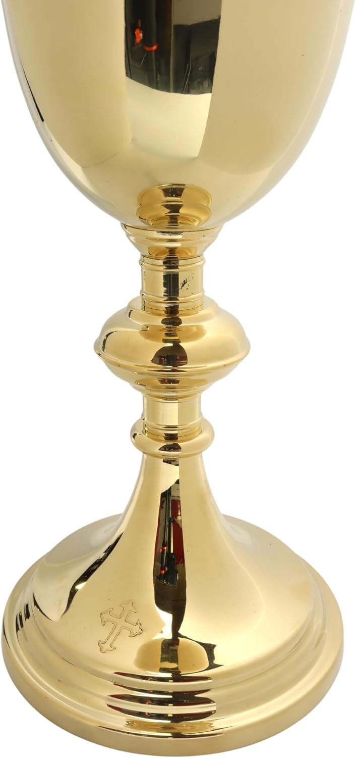 This Polished Brass Chalice, adorned with a cross emblem, stands at 9 inches and brings a sacred presence to Catholic ceremonies with its radiant finish. As a communion essential, it is perfectly sized for liturgical use with an 8.5-ounce capacity, accommodating the needs of the Holy Communion service. The chalice's durable design ensures longevity and resilience for frequent use, while its classic aesthetic presents an elegant addition to the altar. An indispensable vessel, it combines practicality with divine purpose, serving as a focal point for the spiritual ritual of the Eucharist.