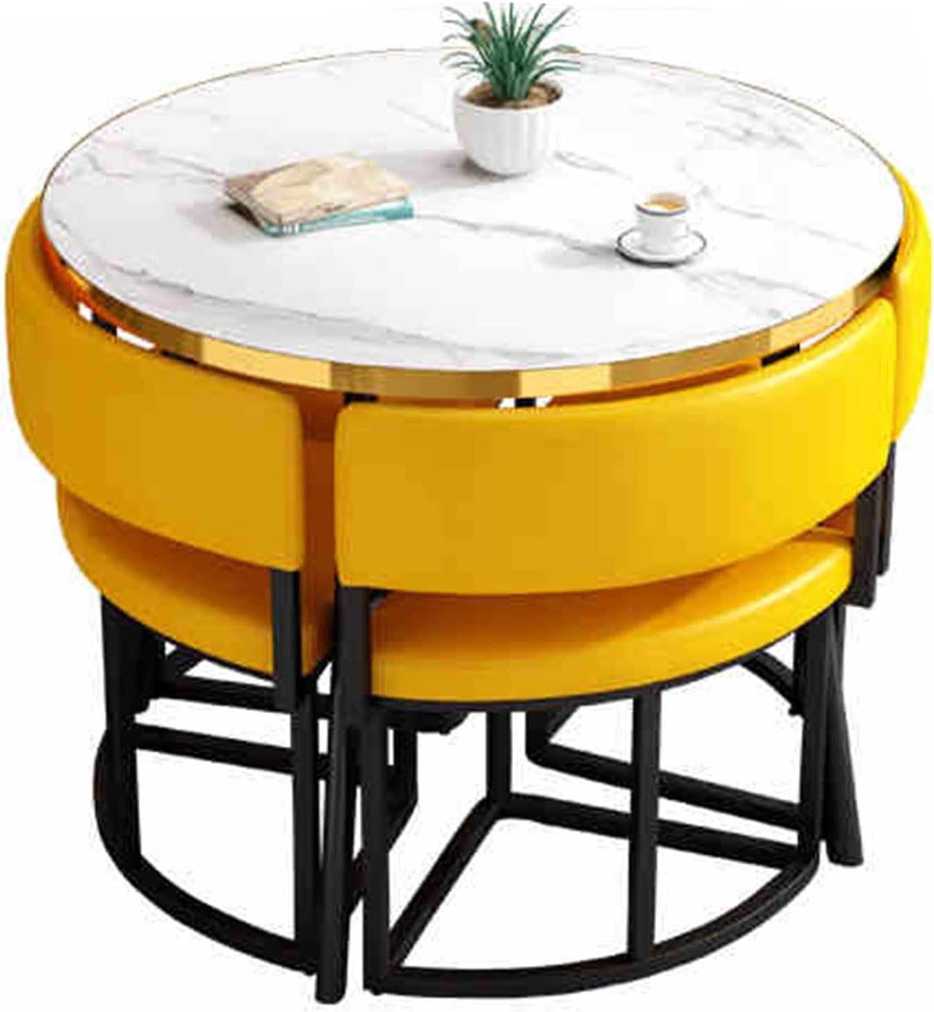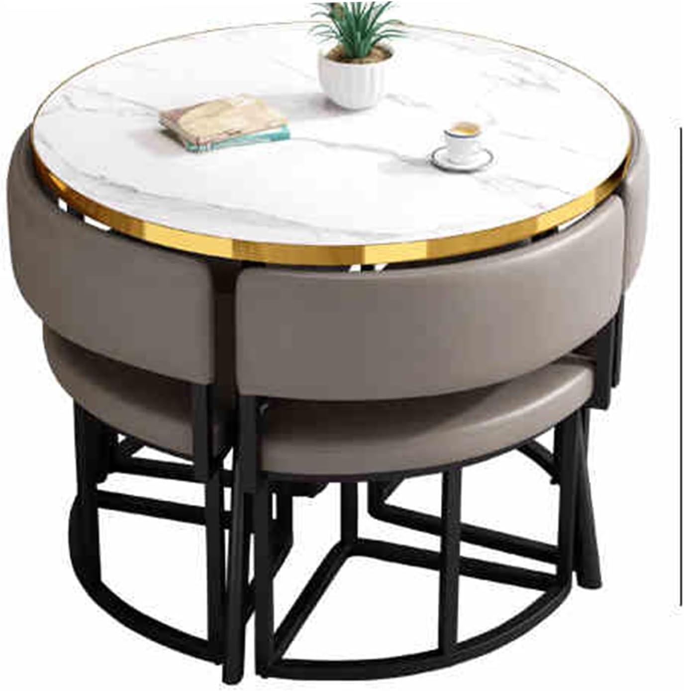 Coffee Shop Leisure Table and Chair Combination,at Office Reception Room, this Office Table and Chair Set can also be used as a small dining table in the kitchen or as a small conference table in the officeComfortable sponge seat bag/backrest, moderate hardness, good resilience, durable, refuses to collapse, making every sitting and standing more comfortableProduct name: office reception room club table and chair setMaterial:High-density environmentally friendly panelsSize: Desktop diameter:31.4in/80cmPacking list: table x1, chairs x4Paired with comfortable chairsSave space and not feel tired after sitting for a long time.Bold metal basePaint process, stable load-bearing and no shaking.Comfortable sponge seat bag/backrestStable and strong, fine texture, easy to clean, environmentally friendly and healthy.Kind tips1. The product is measured manually, and there may be an error of 1-3cm, which is normal.2. Due to different shooting lights/angles/monitors, there may be slight color differences in the pictures, which is not a quality problem.