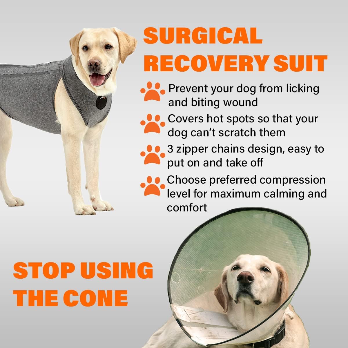The new design full body Recovery Suit for your dog is easy to wear and provides better protection for hot spots, wounds, surgical sutures and bandages, ointments, skin conditions, and more… It is a professional alternative to a cone and full body bandage.Most Torso Coverage, Suitable for Both Male and Female DogsThis new design provides the most torso coverage including the abdomen, shoulders, hips, neck, and back. It does not interfere with male dogs' private parts and thus is suitable for both female and male dogs. Unlike other products on the market that cover the dog’s rear end, making it hard for your dog to discharge and often causing accidents with mess and smell, this dog vest does not block the rear end and is suitable for indoor and outdoor use.Multi-Function: Surgical Recovery and Anxiety CalmingThe new upgraded Cotton / Lycra fabric is soft, breathable, and 4-way stretchable. Your dog should feel very comfortable wearing it. Besides, the 3 zipper chains give you options to use it as a surgical recovery suit (choosing the outer zipper chains for a comfortable fit) or calming vest for anxiety relief (choosing the inner zipper chains to apply full-body compression).Easy to Put On and Take OffUnlike other products that you have to lift your dog’s legs and push or pull through the holes, our dog vest has no holes. To put it on, you just wrap it up to your dog and zip it up, or unzip it to take it off. It is that easy for you and your puppy.Spray Patch Under Neck for Further RelaxationThis new design dog recovery suit comes with a spray patch under the neck, a perfect spot for you to apply essential oils or a pheromone diffuser to further relax and calm your dog. It is an added feature that is convenient and functional. You and your loved puppy will absolutely love it.