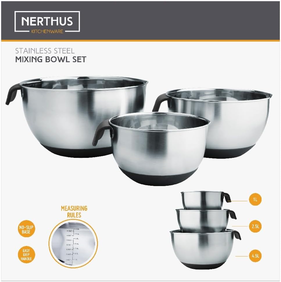 The Set of 3 Mixing Bowls is the perfect addition to any kitchen, offering a versatile and functional solution for all your preparation needs. With capacities of 1 liter, 2.5 liter and 4.5 liter, this set is ideal for mixing ingredients, whisking batters, preparing salads, sauces and much more, becoming an essential ally in both cooking and baking. Made with durable and sturdy materials, these bowls are designed to withstand daily use, ensuring a long service life. In addition, their stackable design allows the bowls to fit inside each other, making them easy to store and save space in the kitchen. They are easy to clean and dishwasher safe, making them a practical and simple everyday choice. Whether preparing complex or simple recipes, this mixing bowl set offers the ideal tools to make cooking a more efficient and organized experience.
