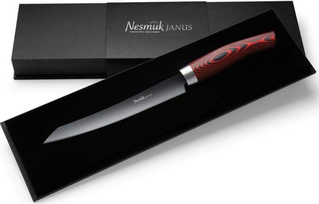 Blade: 6,3 Inches, niobium steel, 60 HRC, flat grind, DLC-Coating Ferrule: stainless steel matt brushed Included: High-quality matt black casket, certificate of authenticity, Care instructions Perfect for a range of tasks, the Janus Slicer 160 shines when used for paring meat, expertly filleting fish, or delicately peeling fruits and vegetables. Its precision is also unmatched when it comes to slicing bacon, ham, and other deli goods with extreme finesse. Experience the art of precision cutting with this unique filleting knife and redefine your culinary skills. The unmistakable hallmark of the Janus collection is the black blade - symbol of the highest quality and functionality thanks to the finishing with the high-quality DLC technology (Diamond-Like-Carbon). As a special coating for the highest stress, it optimizes the functional properties of the blade. The carbon coating, which is only a few micrometers thick, is insensitive to acids, bases and extreme temperatures and is characterized by low friction values and enormous scratch resistance. This makes the Janus series a hand-flattering piece of work for the discerning.