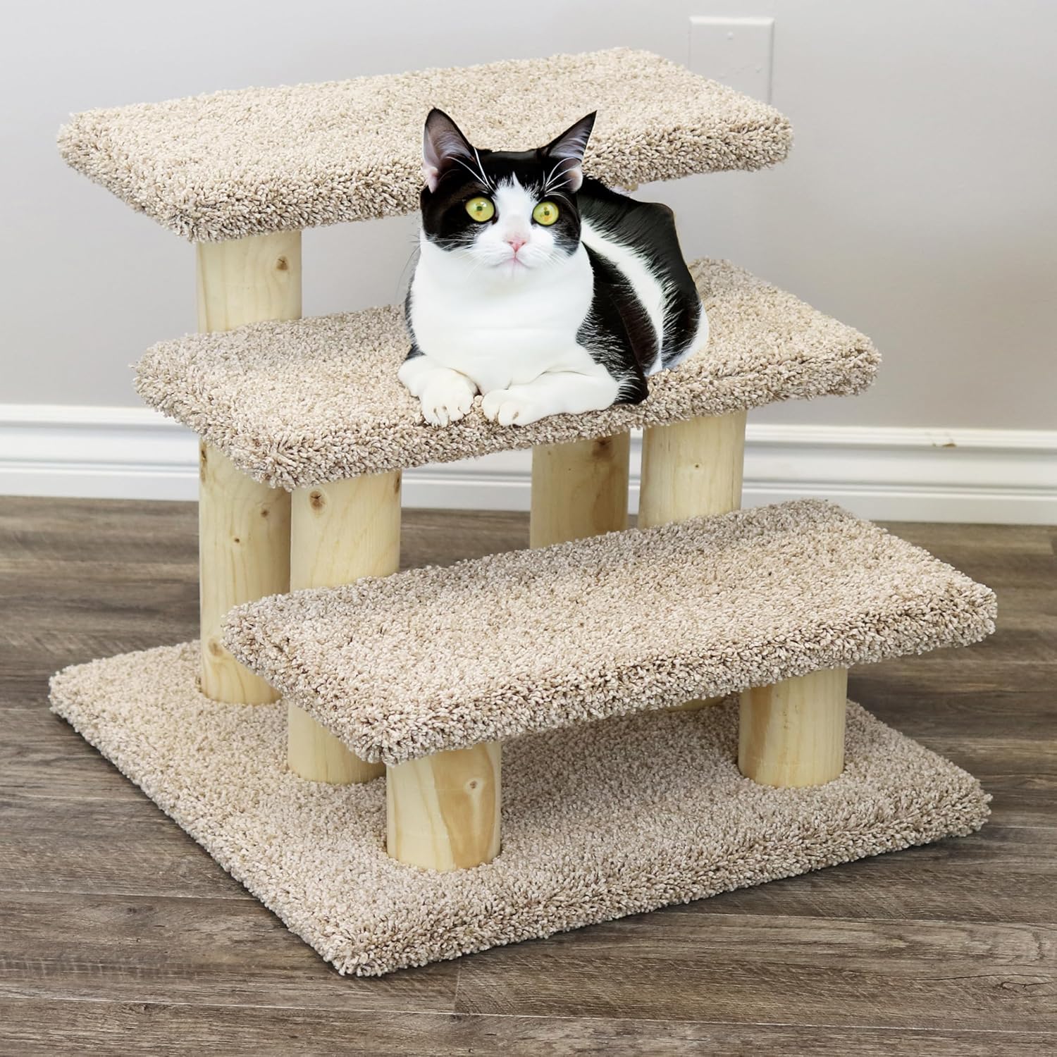 Our wood constructed large pet stairs for cats and dogs are an awesome piece of furniture that can be used for so much more than just your friendly feline! these stairs are constructed from solid wood and peeler cores for strength and durability. These stairs are perfect for multi-pet households for use in helping your animal reach a higher bed, or are extremely helpful for any animal with hip and joint problems. The stairs are made with solid wood cores and the steps are carpeted with household carpeting which helps with shock absorption, and are built tough to provide ease and comfort for years to come! these stairs arrive to you fully assembled, and are proudly handcrafted in the USA.