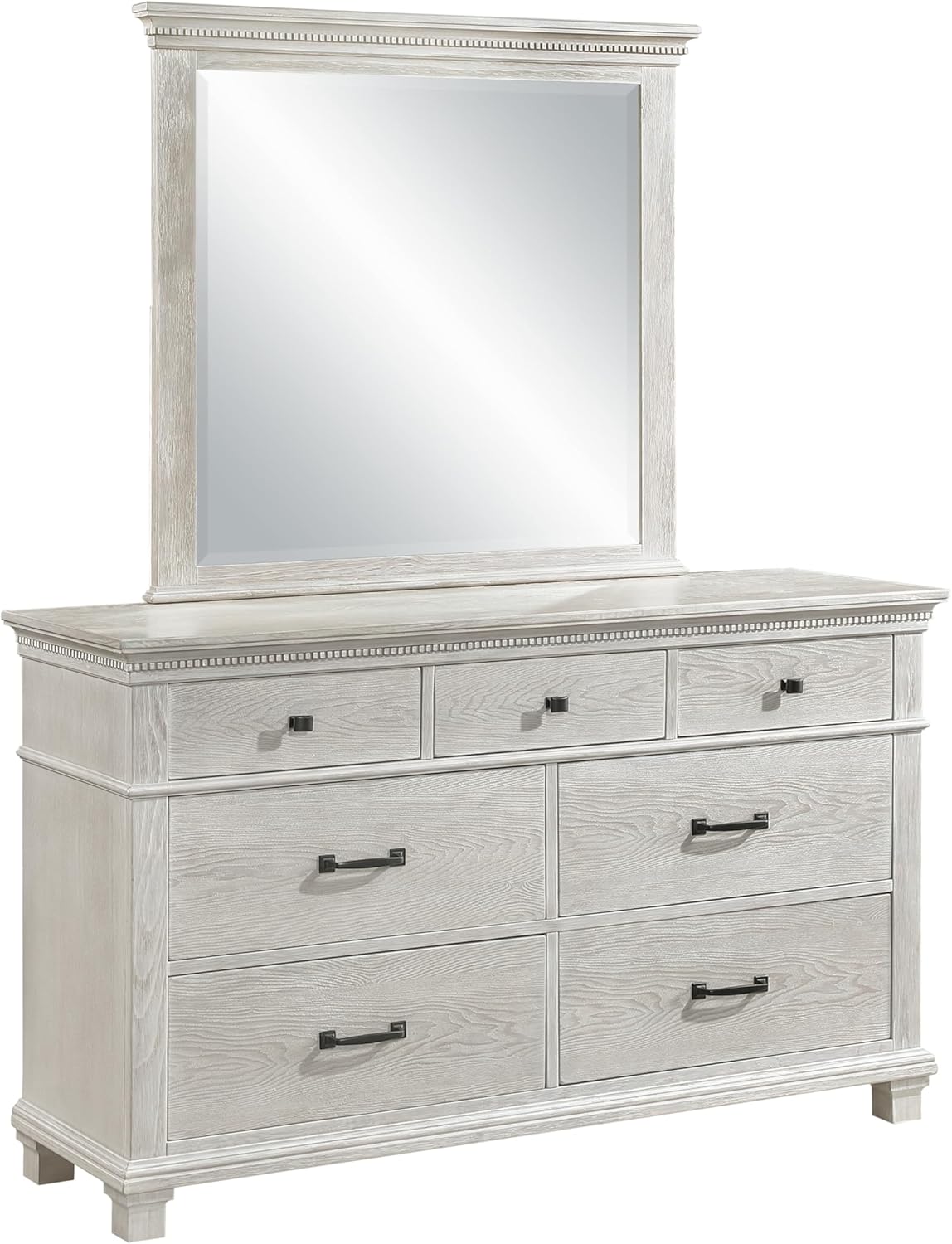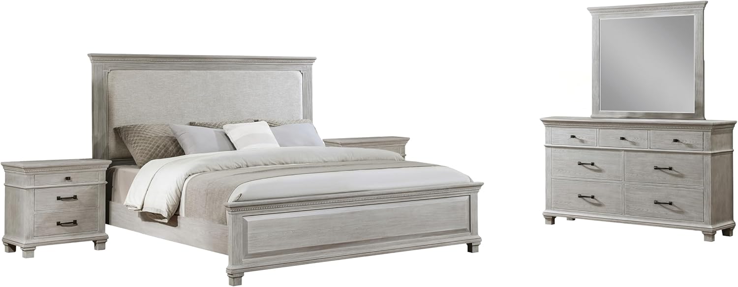 The Silver Sands 5 Piece Wood Bedroom Set in Gray is the epitome of durability and style, making it an ideal choice for any bedroom. This set includes an upholstered panel bed, a dresser, a mirror, and two nightstands, providing a comprehensive solution for your bedroom needs. Crafted from solid pine, manufactured woods, and oak wood veneers, each piece ensures robust and stable construction. The transitional design combines clean, simple lines with a rustic wood finish, creating a calm and inviting atmosphere. The misty gray finish, meticulously hand-applied in multiple steps, brings out the natural grain and mineral patterns of the wood, offering a light, weathered look with a soft, slightly distressed appearance. The bed features a raised panel footboard and a plushly padded headboard, accented by dentil moldings and crown moldings for a sophisticated appeal. The heirloom-quality drawers in the dresser and nightstands are built with durable dovetail joinery and three-stage steel ball glides for smooth, full-extension operation, ensuring longevity and functionality. The 7-drawer dresser provides ample storage for clothing, while the two 3-drawer nightstands keep bedside essentials within easy reach. Velvet-lined top drawers in all pieces protect delicate items. Choose the Silver Sands Bedroom Set for its quality construction, elegant design, and practical storage solutions that enhance any bedroom decor.