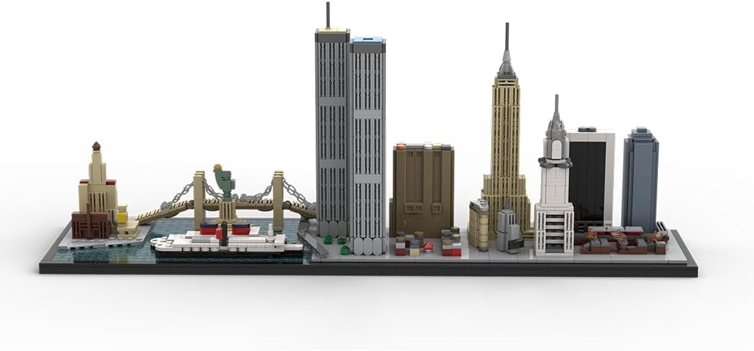 MOC-181871 1/2000 Scale 1970s New York City Skyline Building Blocks Set (1950PCS)Specifications: .Material: ABS .Product Weight: 1900g .Package Weight: 2100g .Product Dimensions:56x 14.4x22.2cm .Package Dimensions: 30.8x 20.8x10cm .Packing: Graphic CartonPackage Including.Building Blocks Set *1