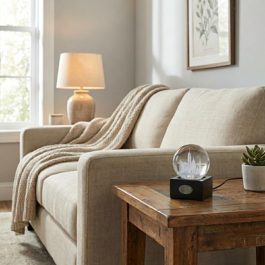 This New York City crystal globe features a detailed 3D laser-engraved Manhattan skyline inside a clear glass sphere. The LED base includes a remote control to cycle through multiple colors — making the Statue of Liberty, One World Trade Center, and Chrysler Building glow dramatically. A silver-tone New York medallion with the Brooklyn Bridge decorates the black wooden base. Perfect for desk or shelf display. Clear glass globe with black wooden remote-controlled LED base, 3.25 inches diameter, 4.6 inches tall.