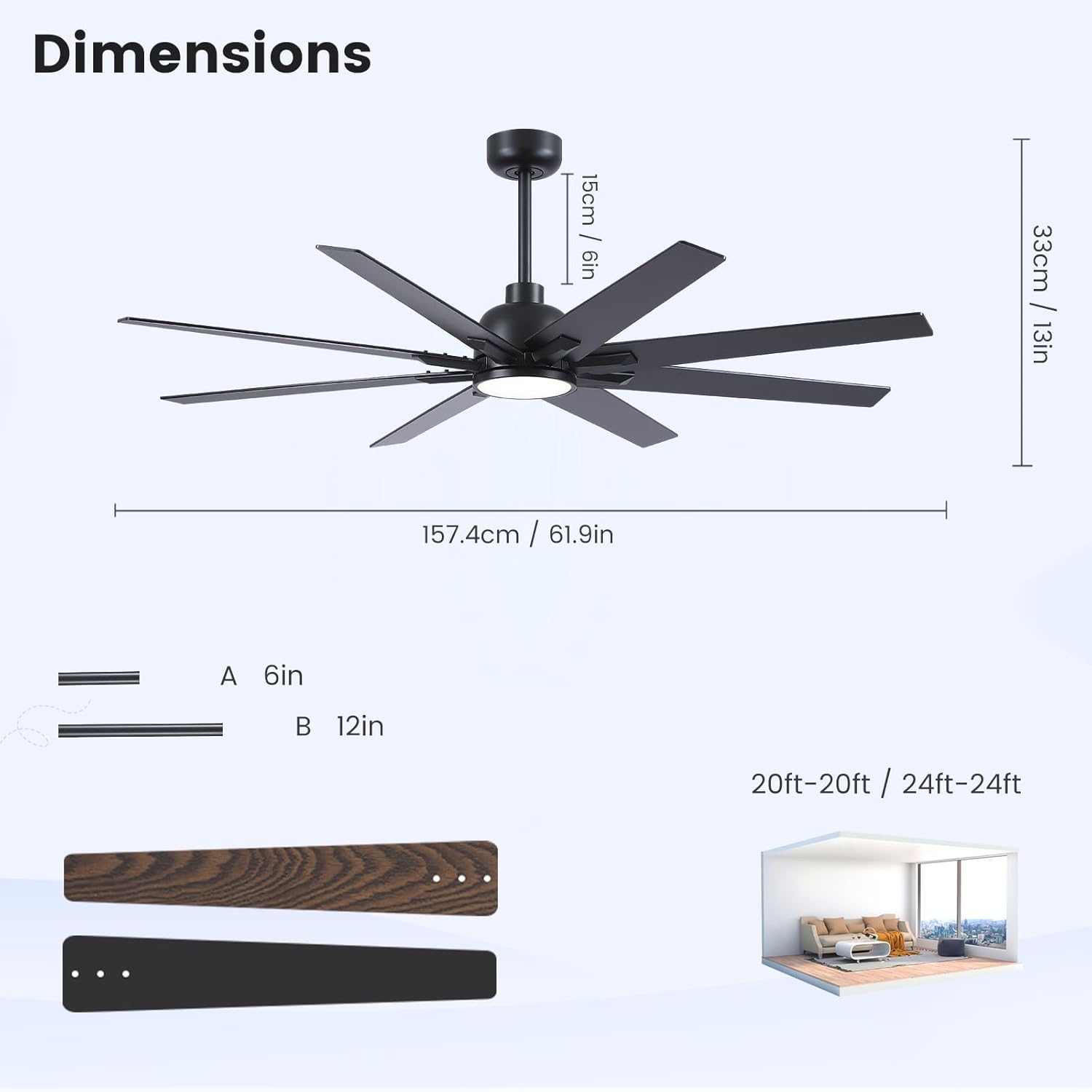 | Included Components | 3 Extension Downrods (6"/12"/24"), 6-Speed Remote with Wall Bracket, 8 Reversible Dual-Color Blades (Black/Walnut), High-Torque 155 RPM DC Motor, Integrated 24W CCT LED Light Kit |