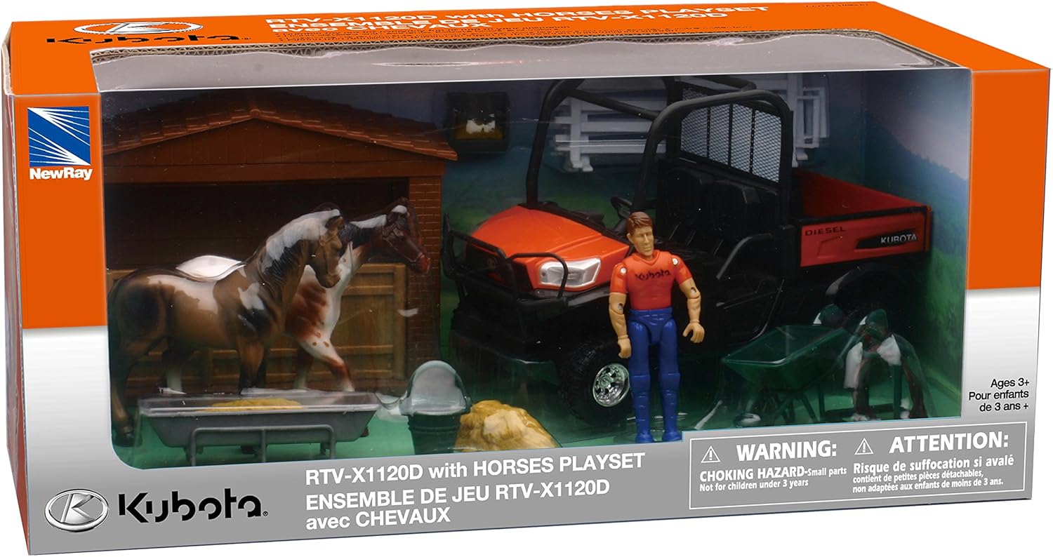 New Ray Toys fits Kubota RTV-X1120D Playset with Figurine, Barn and Horses/ Scale - 1:18