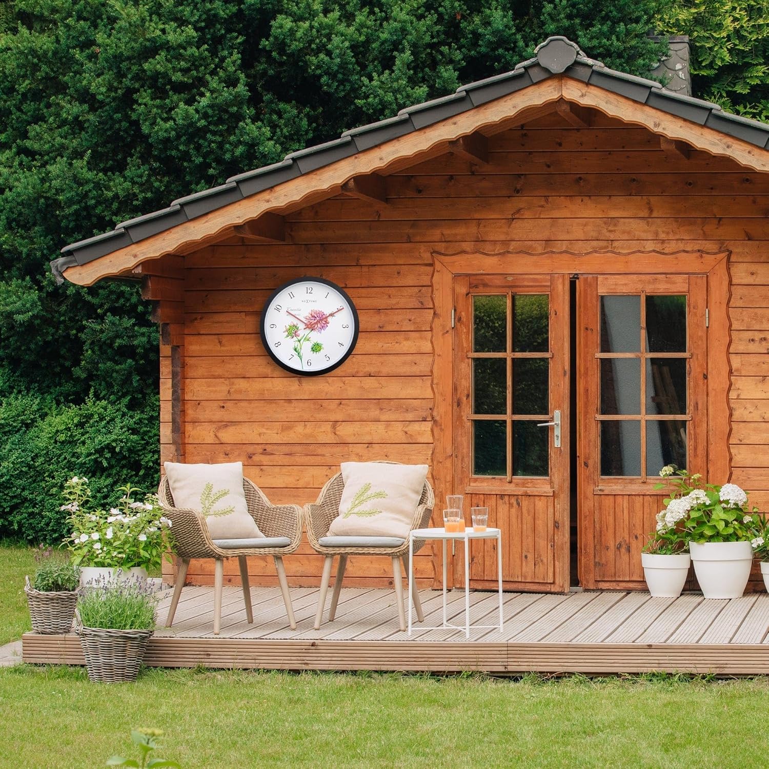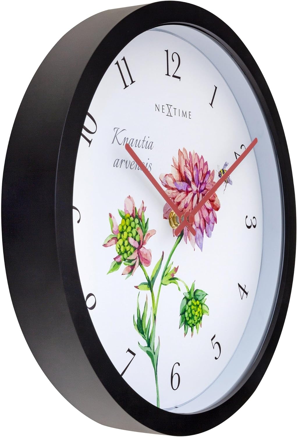 The NeXtime Knautia wall clock, resistant to all weather, is a beautiful functional decoration, The clock has a black case, visible black numerals, and vintage pink hands. The dial is adorned with a special vintage watercolor depicting Knautia flowers, which symbolize pure love, purity and peace. The clock is 12" in diameter and works on 1 x AA battery (not included).