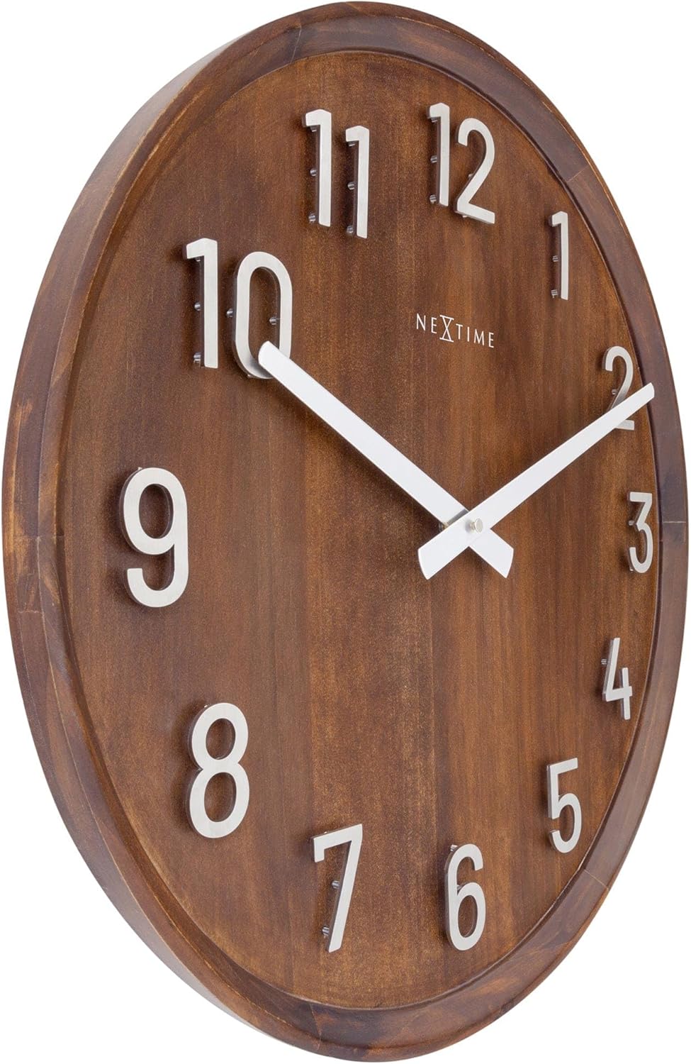 The clock "Precious" (50 cm) is a large silent wooden wall clock with a chic and classy look. The brushed silver metal clock numbers are nailed to the walnut colored natural wood dial, leaving space for projected shadows, creating a sophisticated three-dimensional effect. This clock works with 1 AA battery (not included)