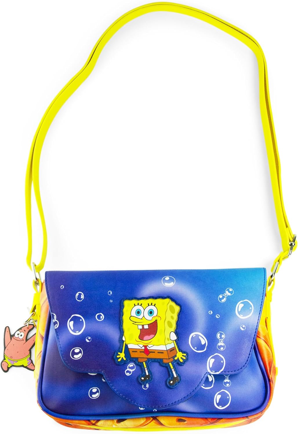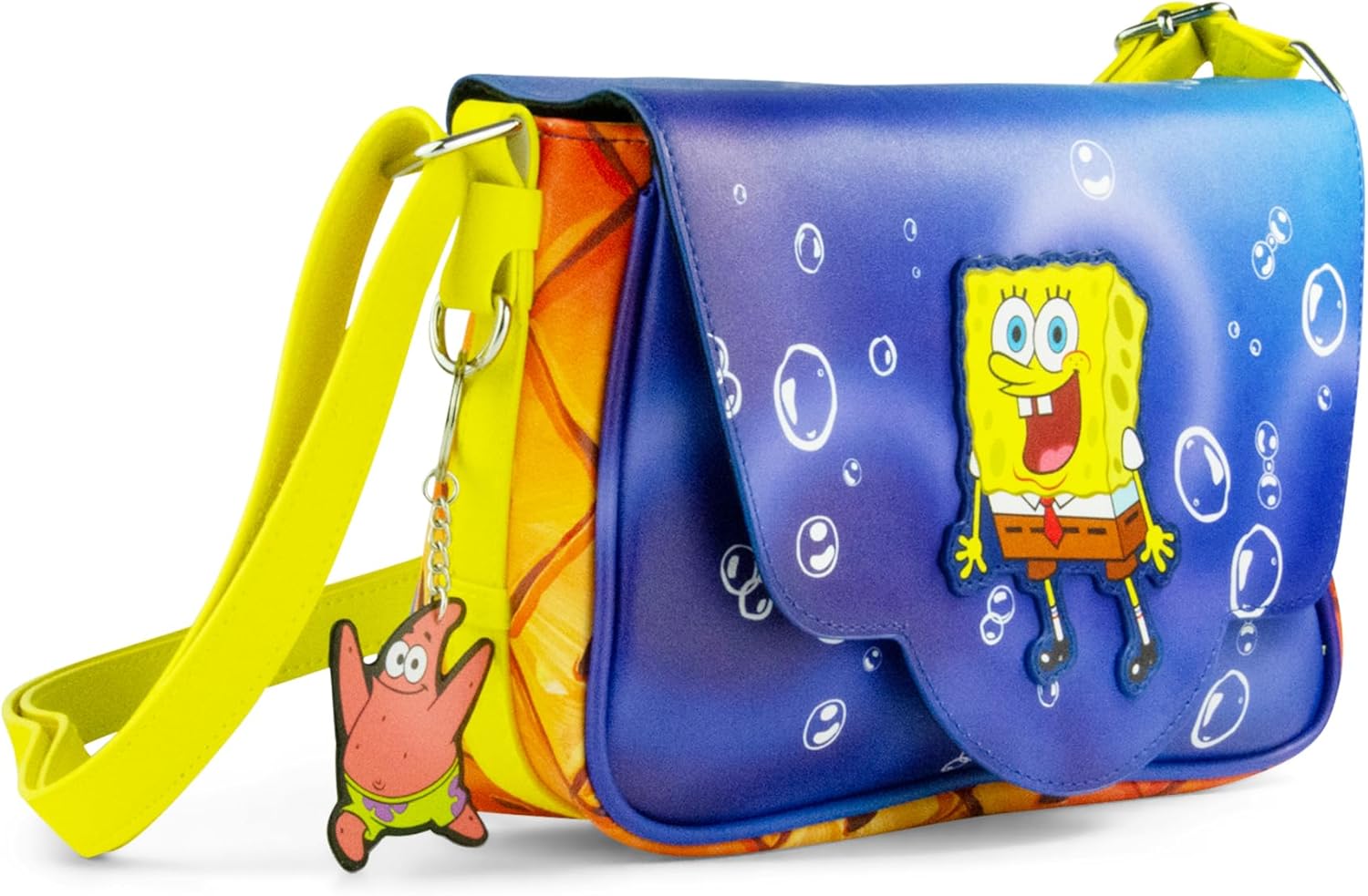 Make every outing more fun with this eye-catching SpongeBob SquarePants Crossbody Bag! Featuring a vibrant underwater design with SpongeBob on the front flap and playful bubble details, this bag adds a splash of nostalgia and personality to your style. The bright yellow strap complements the colorful body, while the attached Patrick Star charm brings an extra touch of whimsy. Perfectly sized for everyday essentials, it offers a roomy main compartment with a secure flap closure to keep your belongings safe. Whether you’re headed to school, a theme park, or a casual day out, this officially licensed SpongeBob bag is the perfect accessory for fans of all ages.