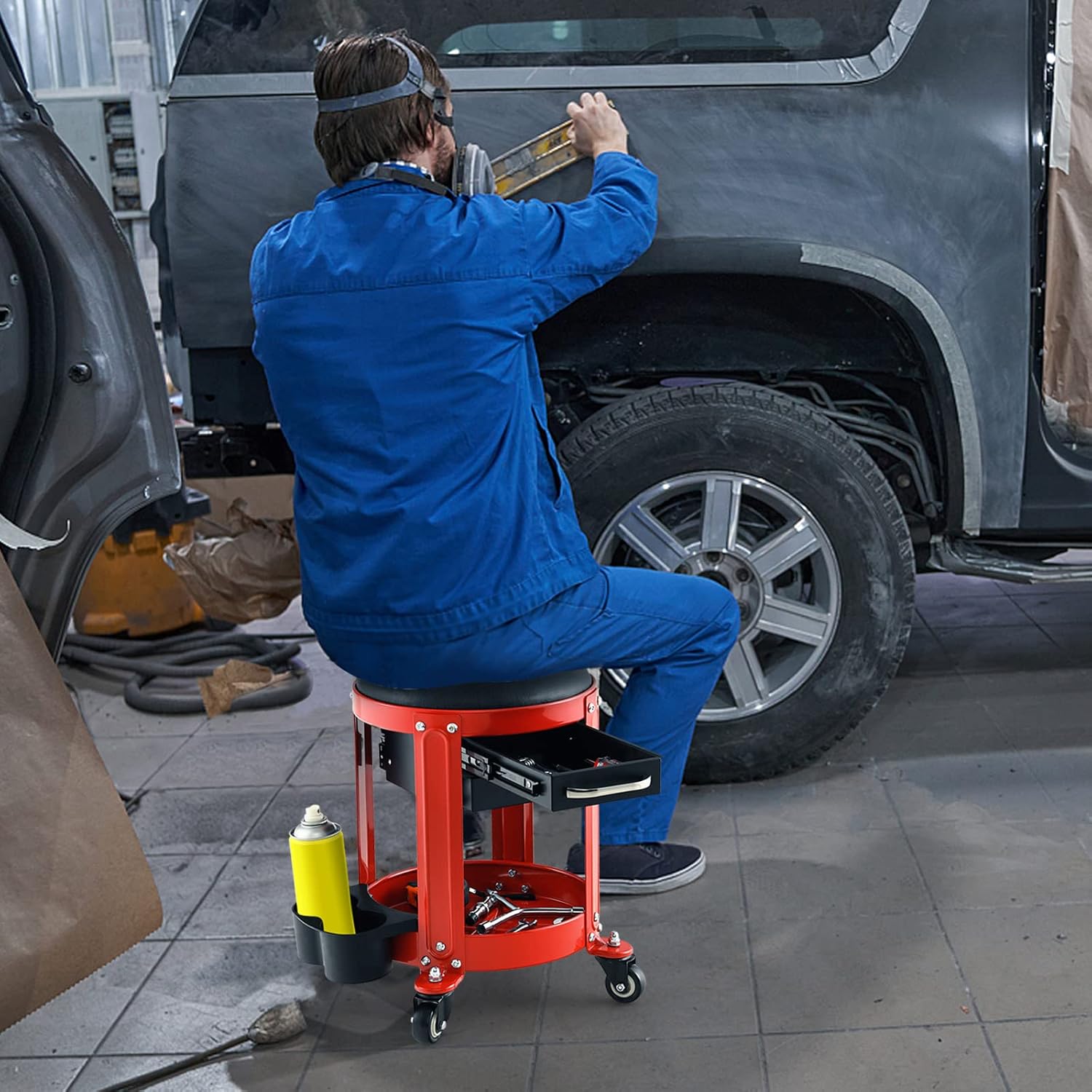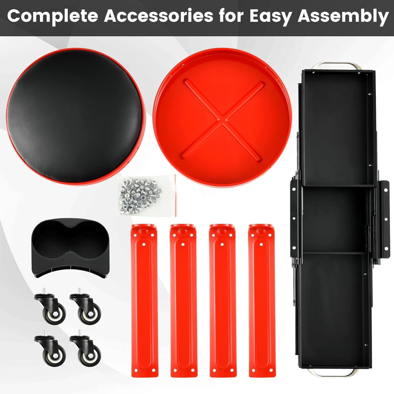 Description:This mechanics creeper stool comes with a large tool tray, twin cup holders and 2 built-in drawers in 2 directions, offering ample storage space for your tools and keeping them within reach. Besides, the seat is padded for comfortable sitting experience. And you can remove it as a kneeling pad according to your different needs. Plus, the waterproof faux leather requires simple maintenance. Supported by heavy-duty metal frame, the mechanic roll chair features large weight capacity up to 330 lbs. With 4 universal casters, you can move the rolling stool from one place to another without effort.Feature:The rustproof metal frame is sturdy enough to hold up to 330 lbsHigh density sponge seat cushion for extra comfortRemovable seat cushion can be used as a kneeling pad for great convenience2 drawers, twin can holders and tool tray to keep your tools within reachThe waterproof and oil-proof faux leather is easy to clean and maintainSmooth edge to avoid scratching your skin during useEffortless to move thanks to 4 universal castersSimple to assemble with clear instructionSpecification:Color: Black and RedMaterial: Metal, Faux Leather, Pearl Cotton, PVCOverall Dimension: 16" x 17" (Dia x H)Size of Seat: 12" x 2" (Dia x Thickness)Inner Dimension of Each Drawer: 9" x 5.5" x 1.5" (L x W x D)Diameter of Each Caster: 2"Net Weight: 13 lbsTotal Weight Capacity: 330 lbsWeight Capacity of Tool Tray: 155 lbsPackage Includes:1 x Rolling Workshop Stool1 x Instruction