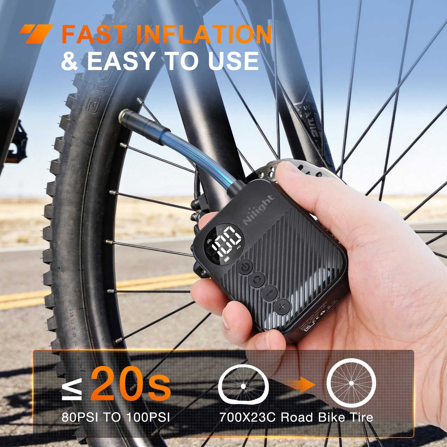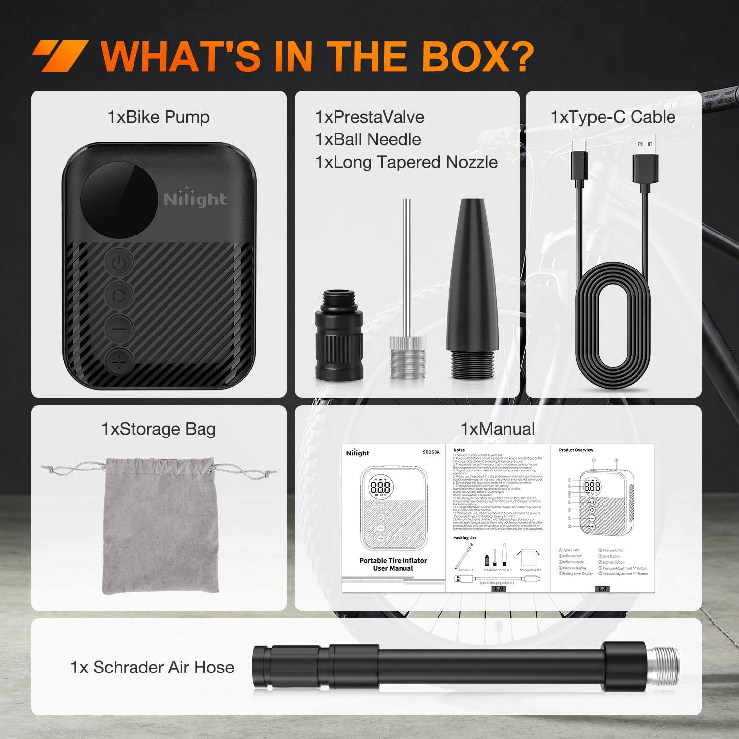 | Included Components | 1x Bike Pump; 1xStorage Bag; 1xType-C Cable;1xPrestaValve; 1xBall Needle; 1xLong Tapered Nozzle; 1xManual;1x Schrader Air Hose |
