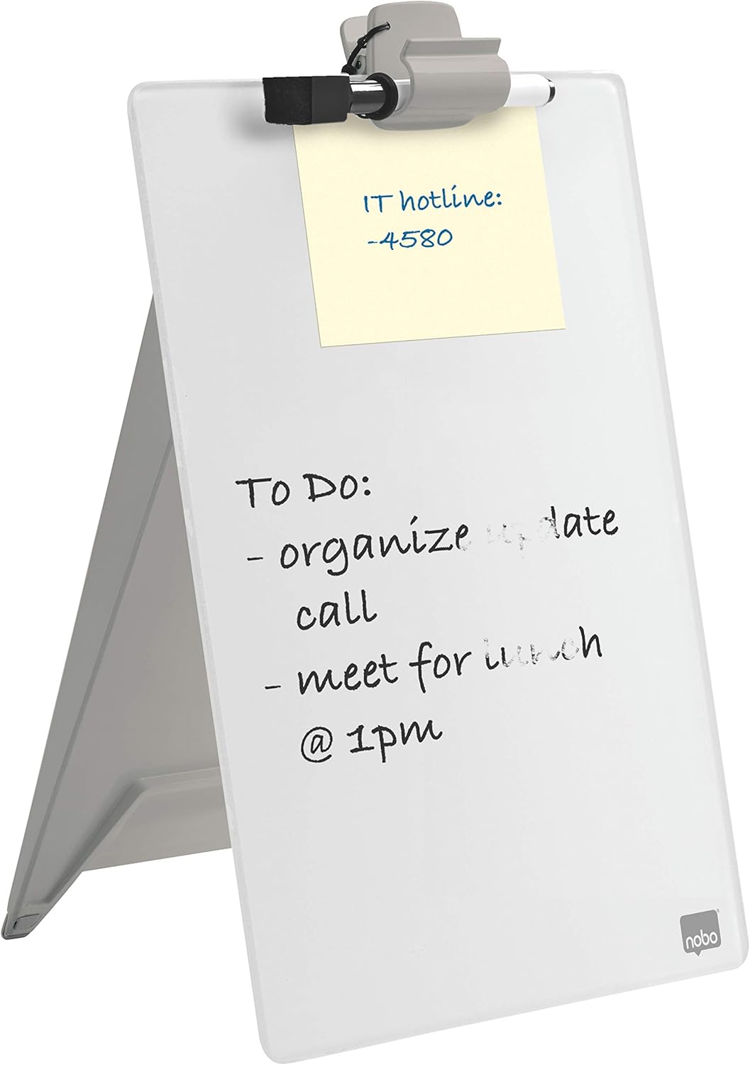 The Nobo Diamond Glass Personal Easel has a tempered safety glass surface suitable for frequent use due to its ultra-eras ability and the high resistance to ink stains, pen marks, scratches and dents. Distinct glass desktop easel developed by Nobo is a contemporary and re-useable alternative to paper based note taking. Supplied with a marker pen.