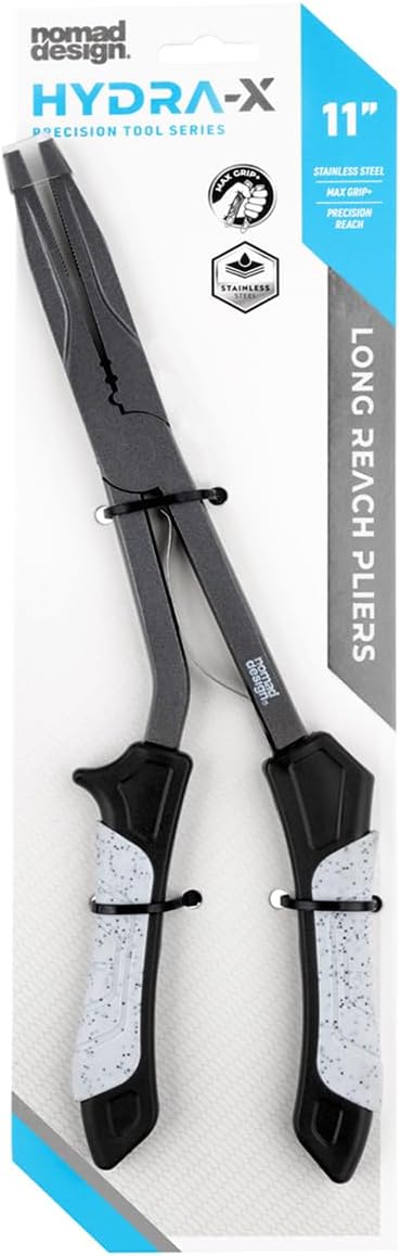 The Nomad Design HYDRA-X 11″ Long-Reach Pliers are built for anglers who need maximum reach, strength and control when dealing with big fish, deep-hooked rigs, or hazardous toothy species. Crafted from premium marine-grade stainless steel and finished with a durable non-stick coating, these pliers are engineered to withstand relentless saltwater abuse while maintaining smooth, reliable performance season after season. The extended 11-inch profile provides exceptional access deep inside a fish’s jaw or allows safe handling when working around sharp hooks. Tungsten carbide side cutters deliver clean, effortless cuts through braid, mono or wire, and the precision-cut jaws grip firmly without slipping. Ergonomic MAX GRIP+ handles ensure you maintain complete control—even with wet, slimy or gloved hands—while the included lanyard and sheath keep this essential tool exactly where you need it when chaos hits the deck. If your fishing demands reach, durability and absolute confidence, the HYDRA-X Long-Reach Pliers are the tool built to answer.
