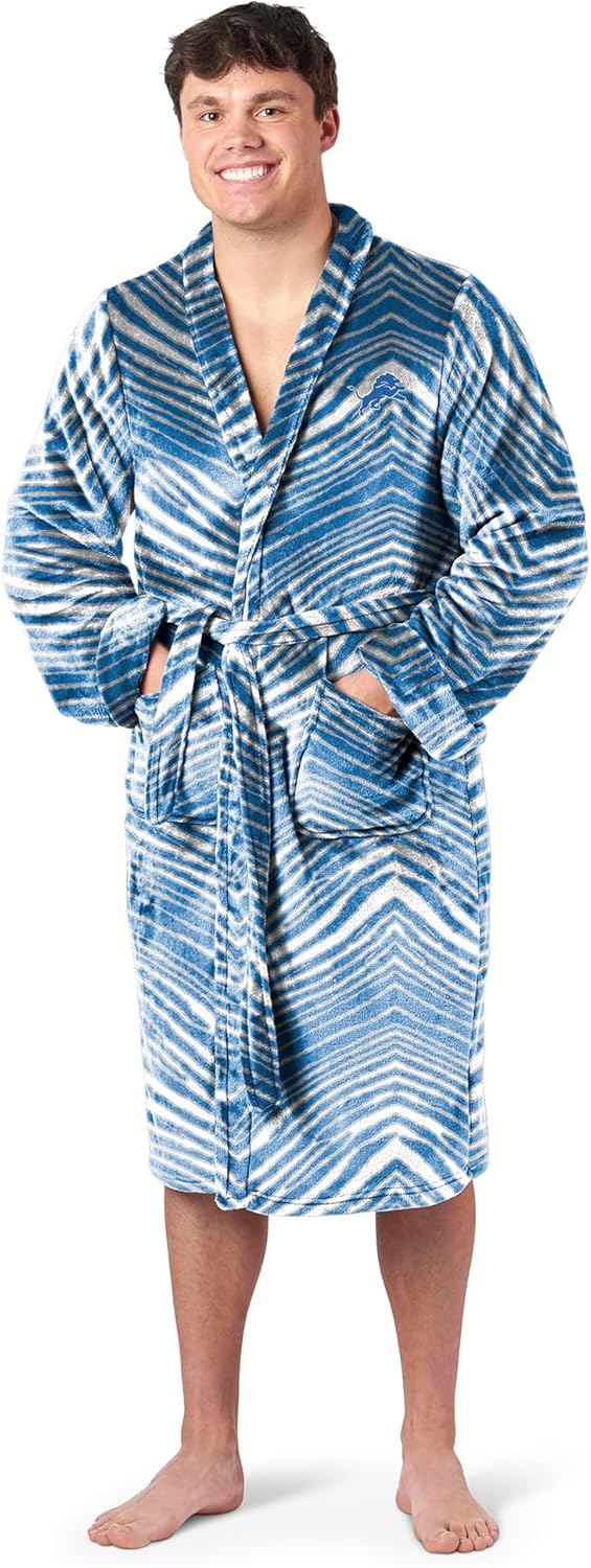 Relax in ultimate comfort and show off your team pride with the Zubaz x Northwest NFL Men’s Classic Zebra Pattern Bath Robe. Officially licensed by the NFL, this silky soft robe features bold team colors and a classic Zubaz zebra design that fans have loved for decades. Made from 100% premium polyester, it’s lightweight, cozy, and smooth to the touch—perfect for lounging, after a shower, or gearing up for game day. With a team logo embroidered on the left chest, two front pockets, and a comfortable tie belt, this robe combines classic Zubaz flair with everyday functionality.