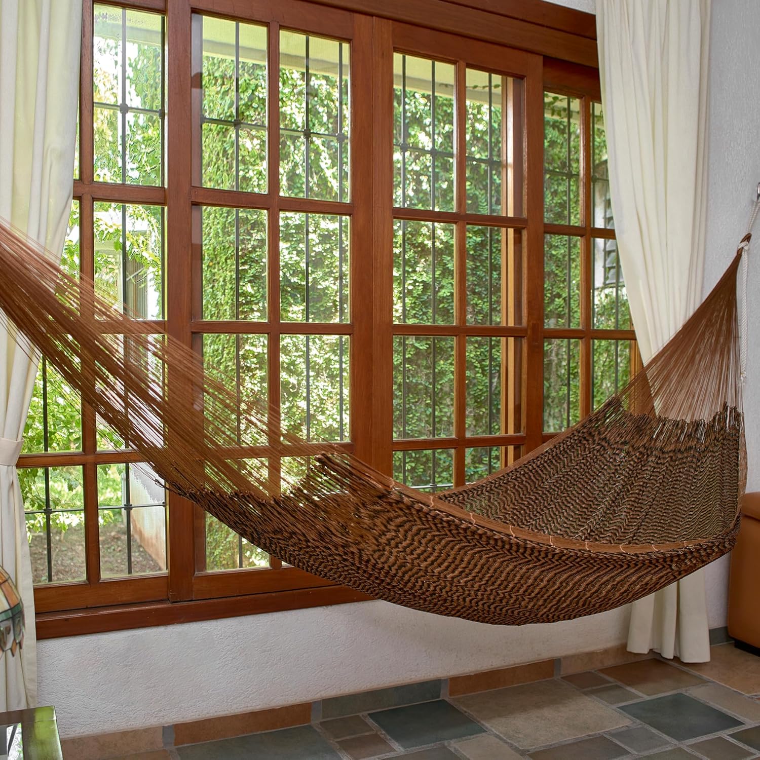 NOVICA, in association with National Geographic, works together with talented artisan designers around the world to produce stunning, keepsake treasures. Our mantra is to spread global happiness, so rest assured - we’ll do everything we possibly can to ensure you’re a happy customer. About this item: Woven by hand in shades of copper and black, this hammock holds the promise of sweet relaxation. Mexico's Maya Artists of the Yucatán preserve the weaving techniques inherited from their Maya ancestors to ensure the hammock tradition. Long before the Spanish arrived upon the coasts of the Yucatan Peninsula, the Maya preferred to sleep and rest in hammocks. They considered the hammock to be like the loving embrace of a mother, due to the comfortable manner in which the body is held and swung within its cradle. Maya Artists of the Yucatan seek to preserve time-honored customs while also offering stylized versions of the original Maya hammock. For them, the hammock is a work of art. Their hammocks are incredibly comfortable, easy to maintain, and may be stored just about anywhere. It easily packs for travel to the beach or lake. Extender ropes (measuring 1 meter), hammock hooks ("S" hooks), and step-by-step instructions included for easy installation. NOTE: Because each is woven individually by hand, measurements may vary by as much as ten centimeters. There may be slight color variations from hammock to hammock. - 'S' hooks and extender ropes included - Holds up to 450 lbs About our Artist: Long before the Spanish arrived in the Yucatan Peninsula, the Maya preferred to sleep and rest in hammocks. They considered the hammock to be like the loving embrace of a mother, due to the comfortable manner in which the body is held and swung within its cradle. Maya Artists of the Yucatan hand-weave stylized versions of the original Maya hammock. For them, the hammock is a work of art. Their hammocks are incredibly comfor…