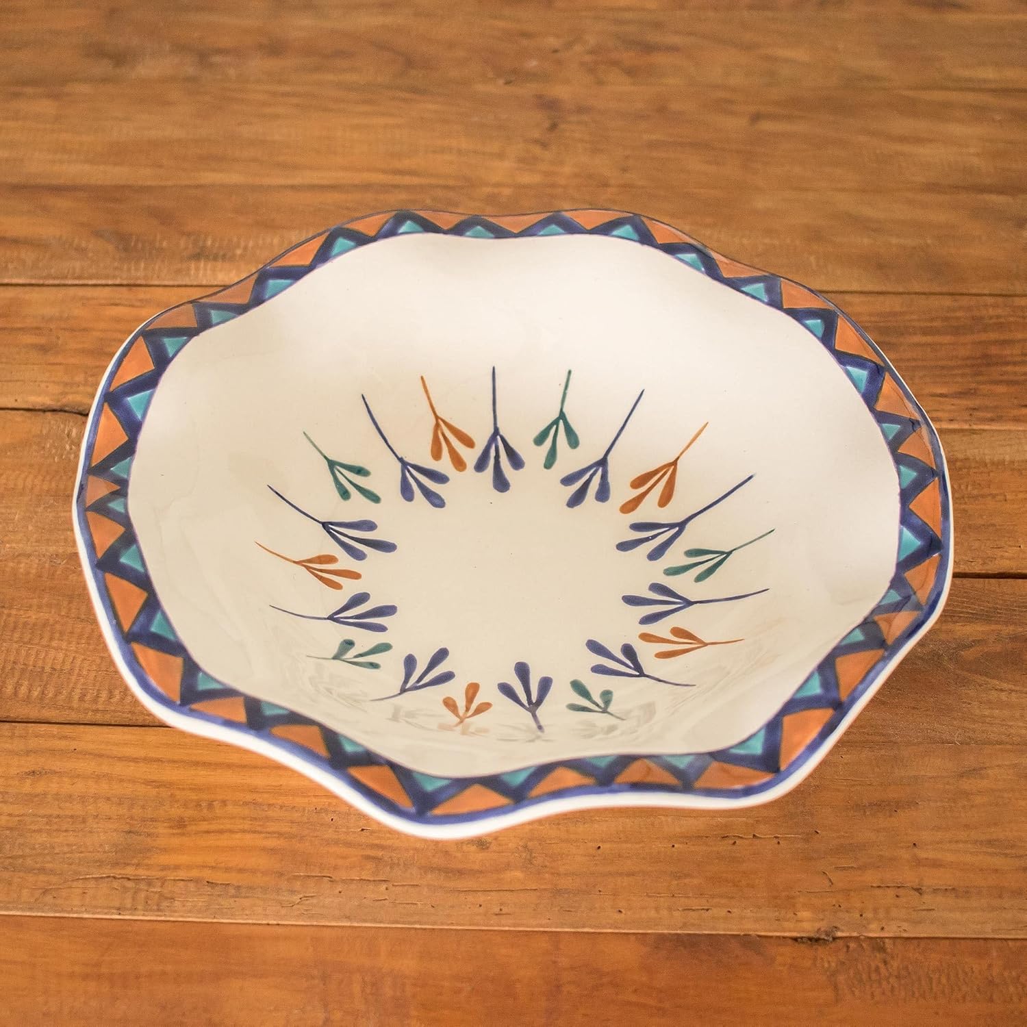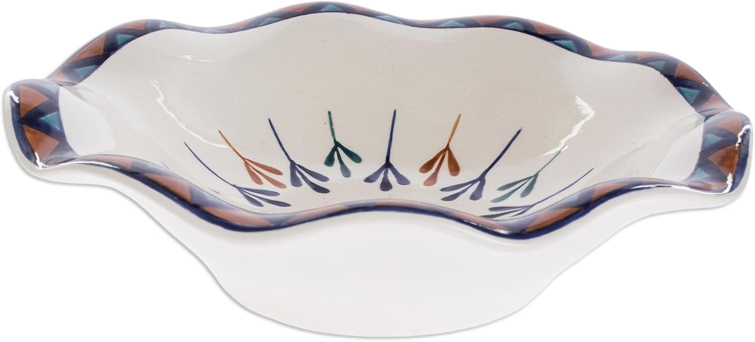 Novica works together with talented artists, artisans, and designers around the world to produce stunning, keepsake handmade treasures. Our mantra is to Spread Happiness, so rest assured - we’ll do everything we possibly can to ensure you’re a happy customer!About this item: Add a rustic and homey charm to your dining room or kitchen table with this pretty fruit bowl. Crafted by Lilyan Benecke, it features a geometric and floral-inspired design in blue and orange on an off-white background.Dishwasher safeFood safeHand-crafted item -- color, size and/or motif may vary slightlyMarked with artist's initials or trademarkAbout our Artist: Guatemala's Lilyan Benecke says, 'I always say it was like love at first sight, because from the very first class I took in ceramics I became fascinated with the technique and the material, and because I was able to combine it with my other passion, painting. Throughout the years, I've trained a group of artisans who now work with me. We feel like a family where we help each other, collaborating together to make the best possible ceramics.'...