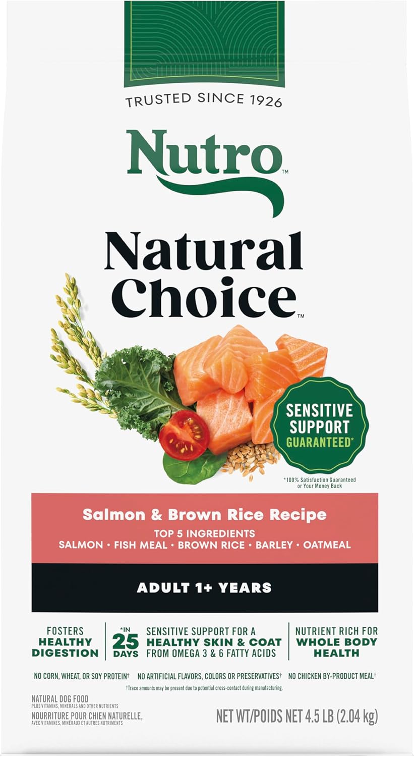 This pet dog food is ideal for dog owners and pet parents who want the best for their dogs. It comes from NUTRO’s partnership with trusted farmers and suppliers to source high-quality ingredients, giving your adult dog nutrition both you and your pet will appreciate. Dog kibble made with chicken as the #1 ingredient and crafted with vitamins, minerals, and other nutrients, NUTRO Natural Choice Dry Dog Food for adult Dogs, Chicken & Brown Rice Recipe brings real, recognizable ingredients to every mealtime. Crafted with wholesome grains and fat, this dry pet food promotes healthy energy for your dog. There is no chicken by-product meal, corn, wheat, or soy protein and no artificial flavors, colors, or preservatives in this quality dry dog food recipe, although trace amounts may be present due to potential cross-contact during manufacturing. With ingredients that promote healthy skin and coat, digestion, and immunity this dry dog food recipe also supports your dog’s vitality and helps provide a healthy diet. Packed with delicious flavor, high-quality ingredients, and supportive benefits, serve your furry loved one something they will love with NUTRO Natural Choice Dry Dog Food Recipes for daily feeding and pet care.