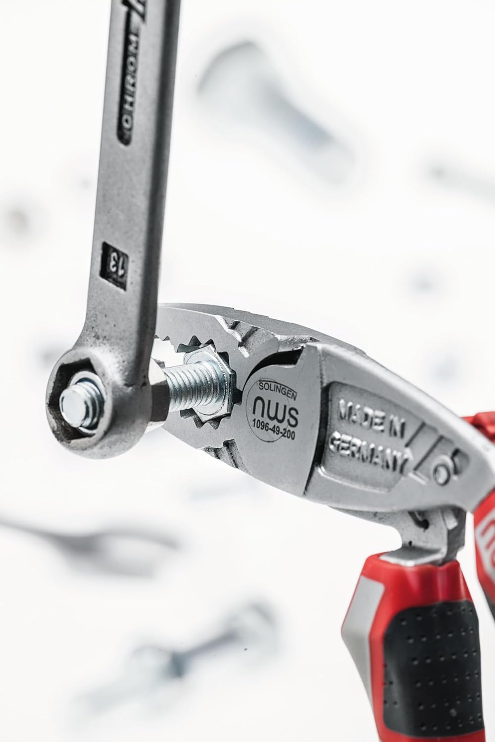 *Please note that this item is not discontinued; however, due to an extended lead time from the manufacturer, it is not currently available for purchase. We will update this listing as more information becomes available.*NWS 1096-49-200 8" Ergonomic High Leverage Combination Pliers ErgoCombi - Matte Chromium - SoftGripp For holding, gripping, bending and cutting work For cutting hard and soft wires Cutting edges inductively hardened Gripping zones for flat and round materials Asymmetric inside jaws for better grip on the workpiece Ergonomic angled head Integrated ring spanner With opening spring and catch Power transmission with optimum leverage for easy and effortless work Handles with ergonomically shaped SoftGripp multi-component sleeves SoftGripp handles with SystemSocket for holding optionally available accessories, e.g. the easily attached SystemClip for fall protection The ergonomic design of the pliers reduces work fatigue and also protects tendons and joints of the user Made of tool steel, forged, oil-hardened