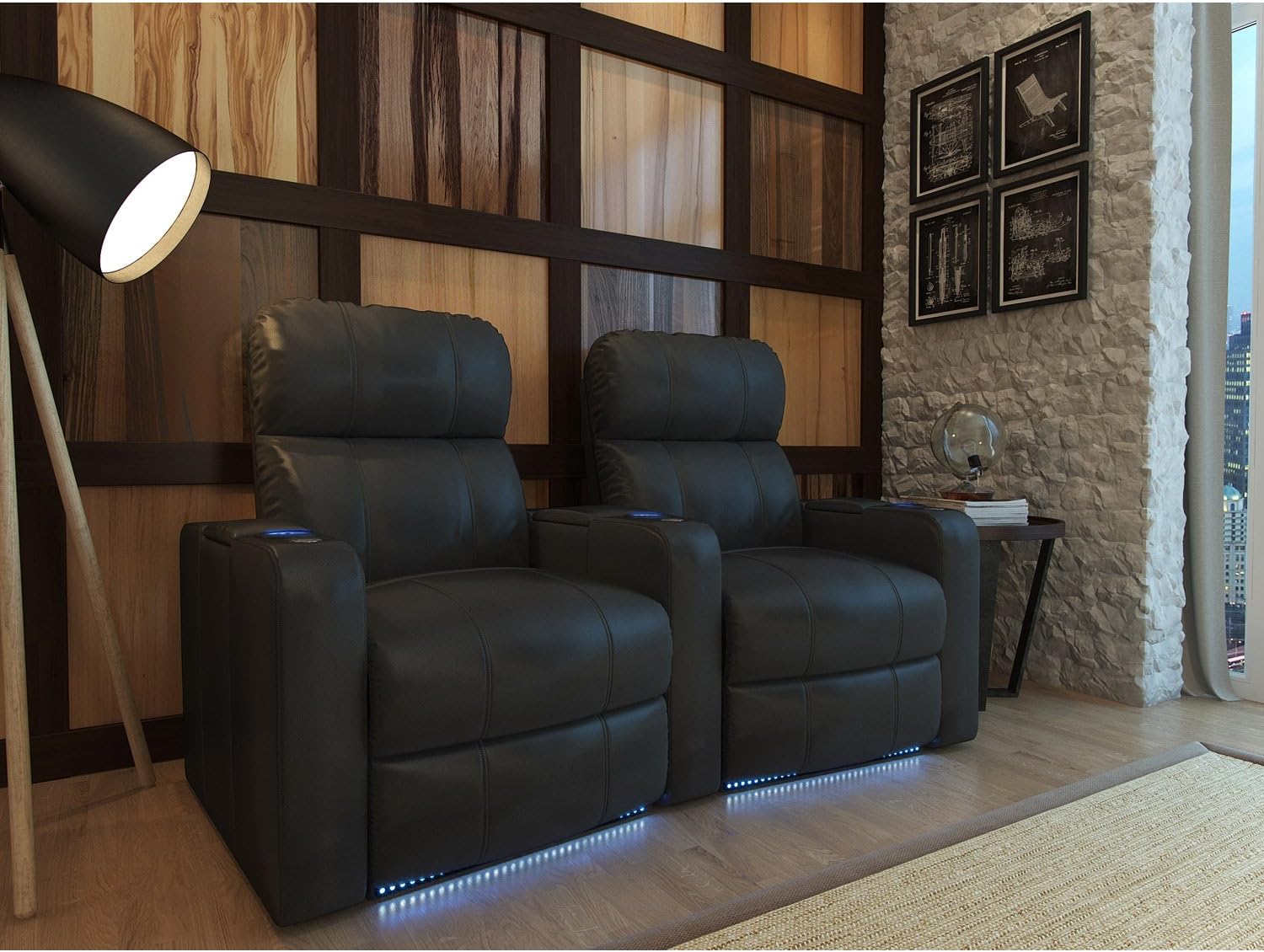 | Additional Features | Blue LED ambient lighted cup holders and lighted baserail for a true cinematic experience, Excellent head and lower lumbar support, Large storage compartment in all arms to place remote controls and other items, Power recline that provides an unlimited amount of reclining positions all at the simple touch of a button |
