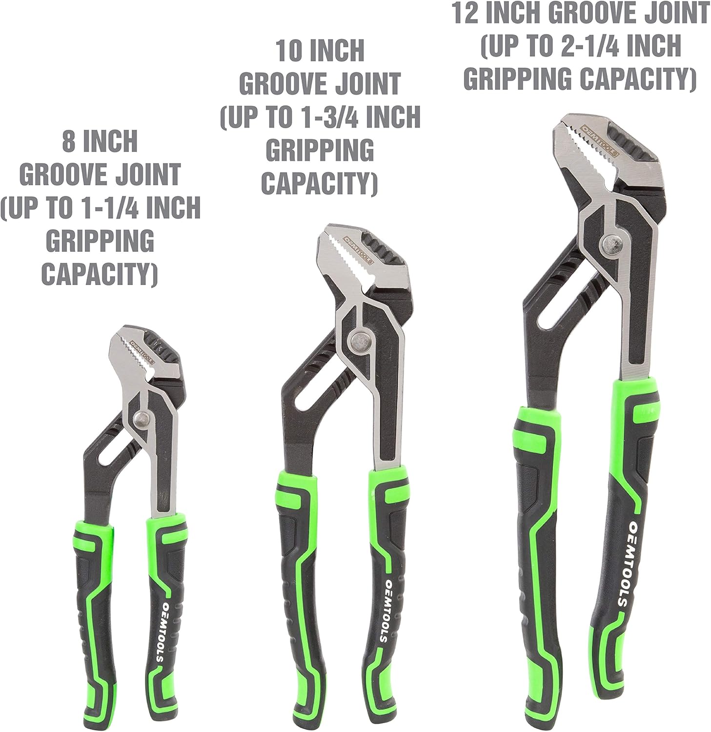 The OEMTOOLS 22648 3 Piece Groove Joint Pliers Set is built for gripping, pulling, and turning tasks in automotive, plumbing, and general repair work. This set includes 8", 10", and 12" pliers with jaw capacities ranging from 1.25" to 2.25", giving you the flexibility to grip a variety of pipe sizes, fasteners, and fittings. Each plier is constructed from chrome vanadium steel for strength and durability, with hardened teeth for a secure, wear-resistant grip. The electro-plated finish resists rust and corrosion in tough environments. Ergonomic TPR grips provide control and comfort, helping reduce hand fatigue during extended use. Designed for professionals and serious DIYers, this pliers set delivers reliable performance on the job or in the garage.