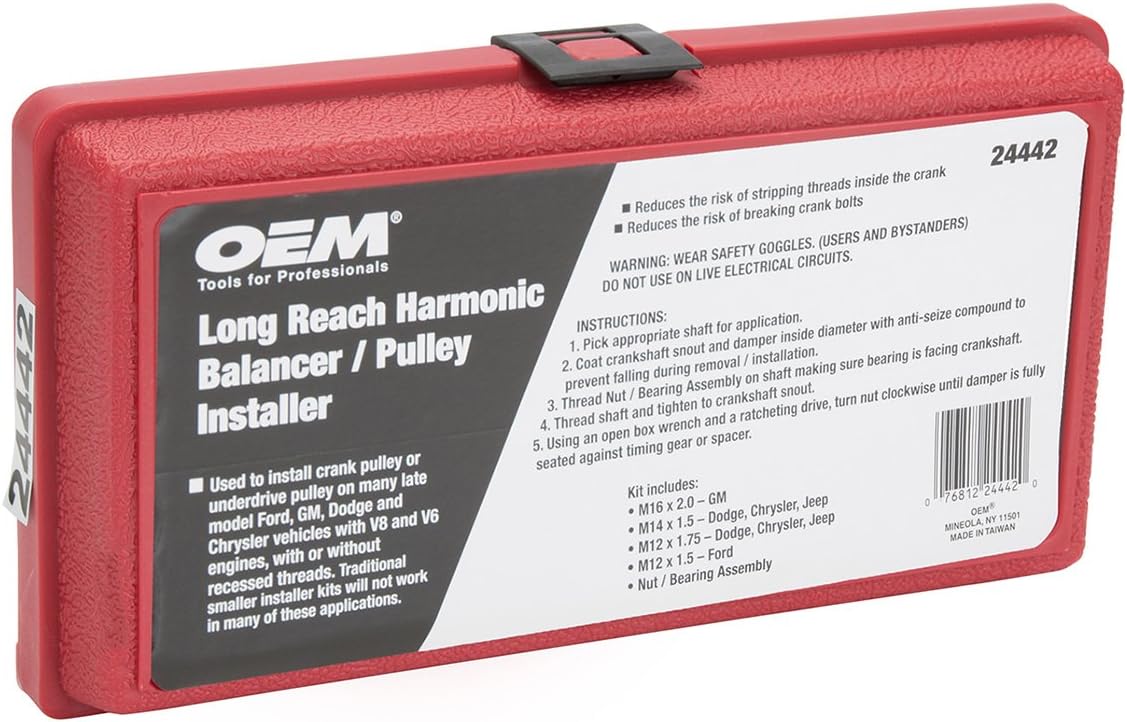 The OEMTOOLS 24442 Long Reach Harmonic Balancer Pulley Installer is engineered for safe, efficient crank pulley installation on V6 and V8 engines. This harmonic balancer installer tool fits recessed threads on many domestic vehicles and includes installer rods for M12 x 1.5, M12 x 1.75, M14 x 1.5, and M16 x 2.0 crankshafts. It helps prevent thread damage and reduces the risk of breaking crank bolts during pulley installation. Use this long reach crank pulley installer on vehicles requiring a precise, centered push for underdrive or harmonic pulley mounting. Ideal for timing cover service, balancer replacement, or water pump jobs, this installer tool eliminates guesswork and strain in tight engine bays. Whether you’re a professional mechanic or advanced DIYer, this pulley installer tool supports fast, damage-free service. Compatible with many domestic applications, it offers a secure grip and consistent force to ensure a smooth install—without damaging engine components.