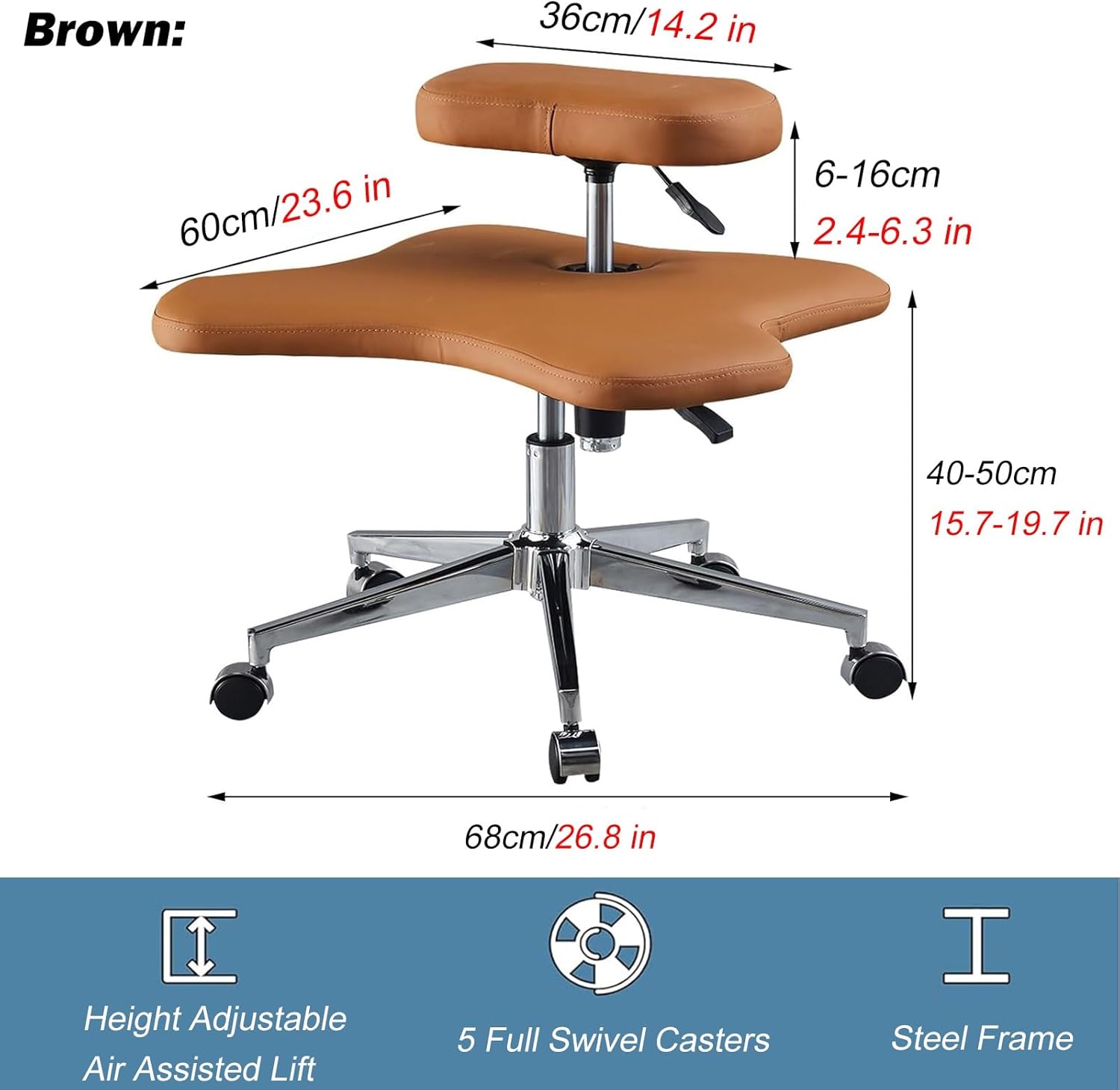 Meditation Chair:What is this? This cross-legged chair is stylishly designed to fit the needs of any environment, adding to your home or workspace. Take the décor of your home to new heights. Specification : 1. Product Name: Ergonomic Kneeling Chair 2. Product Material: Steel frame + Microfibre Leather Fabric 3. Product Color: Black , Brown , Gray , White 4. Product Weight: 12kg/26.5 lbs 5. Liftable Or Not: Yes 6. Space Requirements: 1㎡ 7. Recommended User Height: 1.5-1.85m/(4.9-6.1 ft) 8. Applicable Table Height: 78-92cm/(30.7-36.2inch) 9. Recommended User Weight: 45-90kg/(99.2-198.4 lbs) Features : 1. Double-deck design with adjustable height. 2. Ergonomic design improves sitting posture. 3. Microfibre Leather rebounds quickly and is easy to clean. 4. Strong and durable, can easily support 150kg/330.7 lb. 5. Includes swivel wheels at the bottom for easy mobility. 6. Wear-resistant and pressure-resistant, safe and reliable. 7. Ideal for home, office, school and many other settings. 8. Adjustable height, suitable for people of different heights. 9. Different sitting postures, such as cross-legged, kneeling, squatting, etc. 10. Thick seat and leg cushions provide positive support for every position. Package Includes : 1 x Cross Legged Chair Tips : 1. There may be an error of 1 cm due to manual measurement. Please refer to the actual product. 2. There may be chromatic aberration due to the difference between the recording lamp and the display. Please refer to the actual product.
