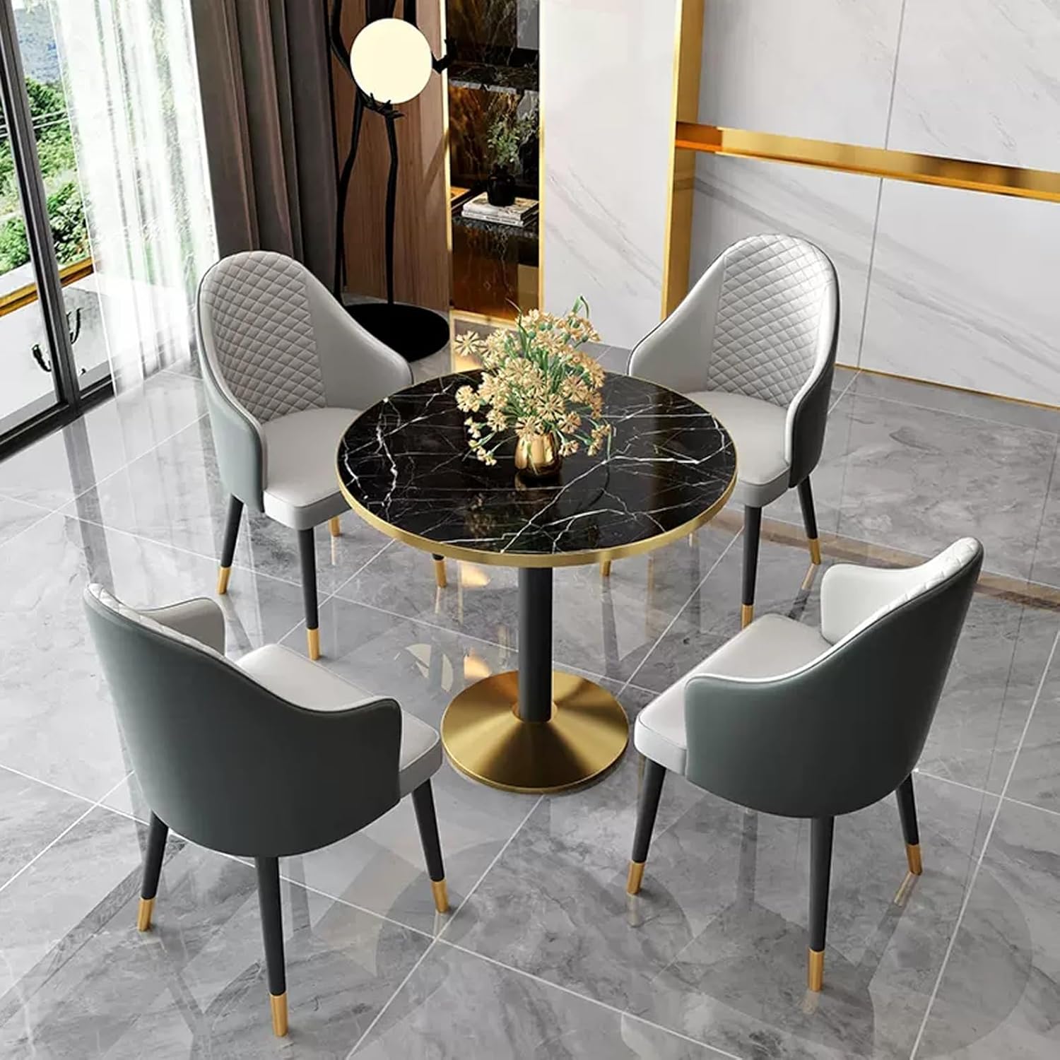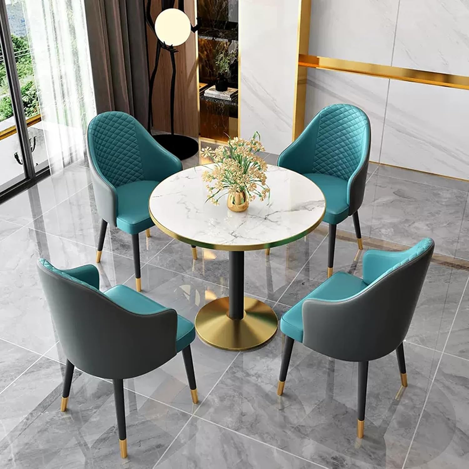 √ Fascinating Business Reception Negotiation - Small Conference Desk & Chair Set - Meeting Room Table and Chair Set will complement any Office or home décor.√ Coffee Shop Leisure Table and Chair Combination,at Office Reception Room, this Office Table and Chair Set can also be used as a small dining table in the kitchen or as a small conference table in the office.√ This table and chair set also can be placed in your beauty shop, nail salon shop, beverage shop, hotel lobby or Variety Business shops.▶ Product Parameters:Product Name: Table and chair combinationFeatures: Simple,generous,space savingColor: Reference pictureStyle: simple and modernBracket structure Material:MetallTable Shape: RoundDesk top Material: environmentally friendly boardsTable top diameter: 24"/60cm , 28"/70cm , 32"/80cmTable top thickness: 25mm /1inTable height: 75cm/29.5inChairs material: PU leather,Total chair height: 90cm/35.4inSeat depth: 50cm/19.7inSeat loading: 100KGApplicable number: 4 peoplePacking method: assemblyPacking list:1*table,4*chairs▶ Warm Tips:1. Size Description: The product is completely measured by hand and may have an error of 1-3 cm. Please refer to the actual items received.2. Picture description: The product is real. Due to problems with light, angle, display, etc., there may be slight chromatic aberration, please forgive me.