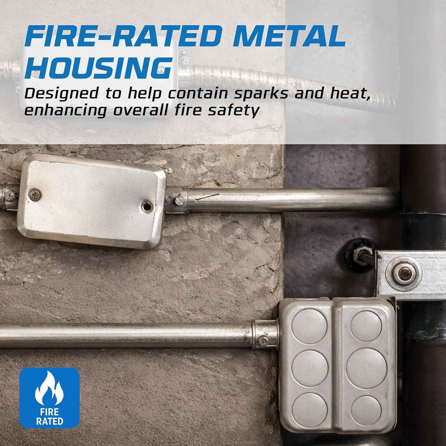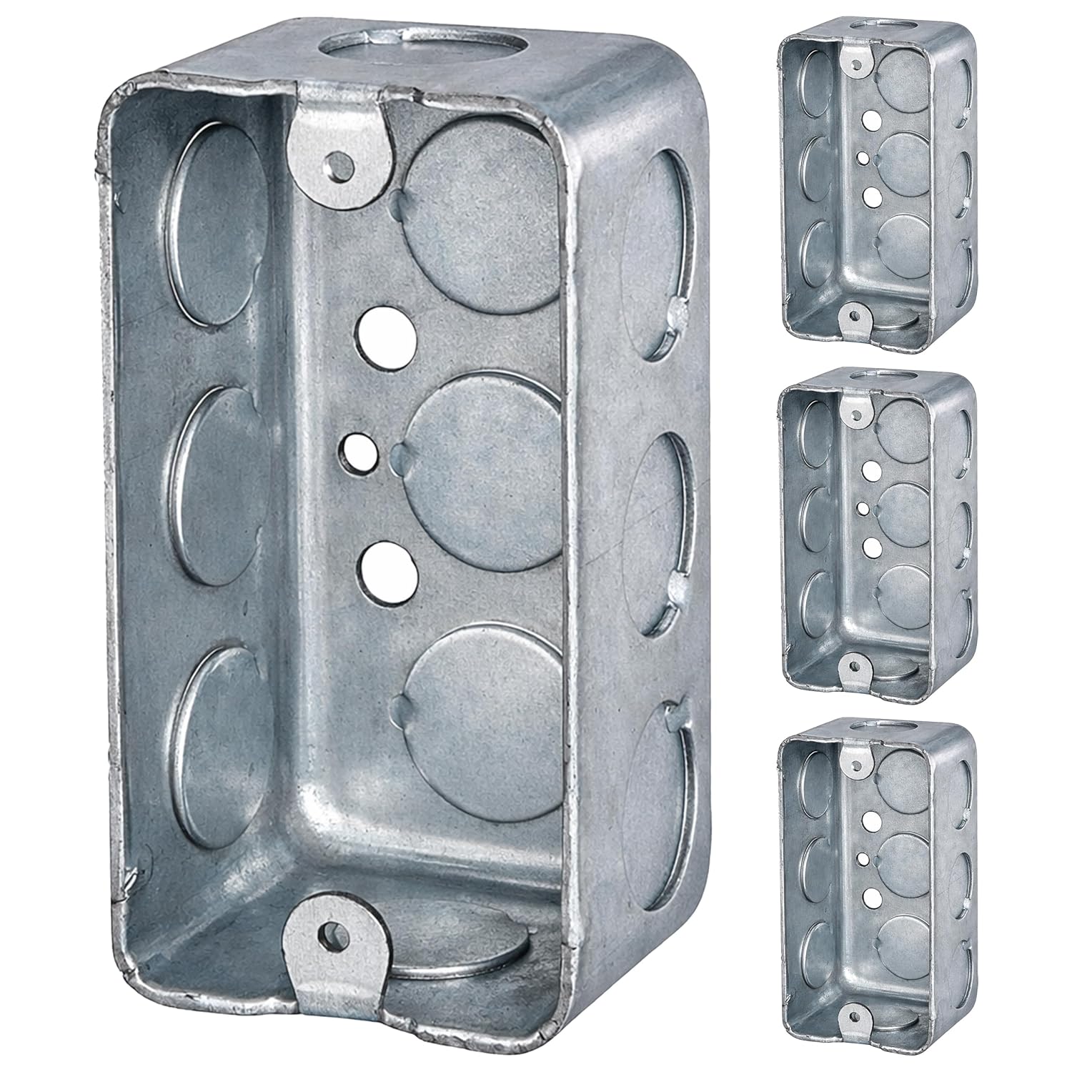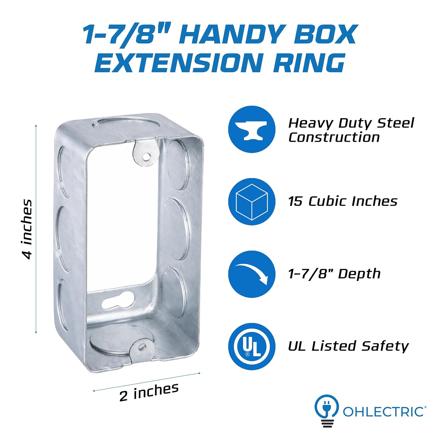 Introducing our premium quality galvanized steel electric extension box ring, a perfect solution for home improvement and electrical equipment installations. This 2x4” utility size handy box, also known as a junction box, is designed to supply power to several electrical devices while splitting multiple conductor runs in two or more directions. Ideal for lighting fixtures, switches, and receptacles, its exceptional design prevents plaster and drywall mud interference during installation. It features a 4” Rectangle Steel Electric Extension Ring with 1/2" & 3/4" Knockouts, ensuring easy installation and secure fitting.The fire-rated box is manufactured using galvanized steel, offering superior durability and safety. Its sturdy screw heads ensure secure attachment, preventing loosening over time. This electrical box extender is an ideal choice for both indoor and outdoor applications. Thanks to its waterproof design, it can be used as an outdoor electrical box, even in harsh weather conditions. It offers compatibility with a wide range of electrical outlet boxes, including single gang electrical box, 2 gang old work box, 3 gang electrical box, and up to 5 gang electrical box.Invest in this electrical box for reliable and safe electrical installations. It's not just a junction box, it’s a solution for all your electrical box needs. Whether you're installing a receptacle outlet box, a wall plug, or an outdoor electrical box waterproof, this product is an excellent choice.