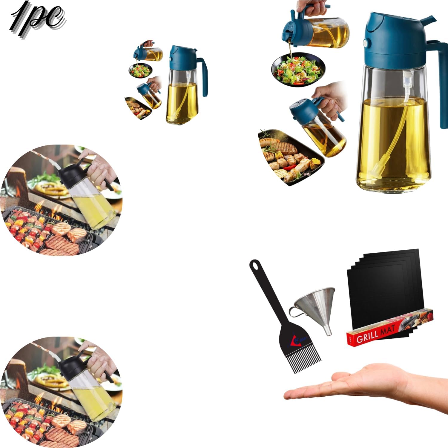 Transform your cooking experience with this comprehensive oil sprayer bundle. The set includes a generous 16-ounce glass bottle for your favorite oils, paired with practical accessories to enhance your kitchen routine. The stainless steel funnel ensures mess-free refills, while the silicone brush helps you achieve perfect coverage for your culinary creations. A BBQ grill mat rounds out this versatile collection, making it ideal for various cooking applications. The refillable oil mister delivers a fine, controlled spray that's perfect for air fryers, grilling, salad preparation, and general cooking needs. The glass bottle construction helps maintain oil freshness and provides clear visibility of contents. This all-in-one kit brings convenience and precision to your kitchen, helping you manage oil usage while keeping your cooking surfaces clean and well-maintained. Whether you're seasoning a salad, preparing an air fryer dish, or grilling outdoors, this sprayer bundle offers the tools you need for efficient oil application.