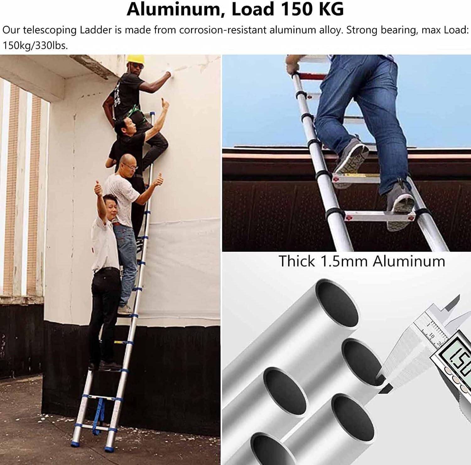 Multi-purpose step ladders, household ladders, folding ladders and telescoping ladders, we believe that safe ladders are critical for home, office, cargo, access to rooftops and large buildings. Great for painting the walls, change light bulbs, clean windows interior decoration and so on.★ SpecificationMaterial: Aluminium alloyUnfolded Height: 1.4m/4.6ft, 1.8m/5.9ft, 2m/6.5ft, 2.2m/7.2ft, 2.6m/8.5ft, 3m/9.8ft, 3.4m/11ft, 3.8m/12.4ft, 4.2m/13.8ft, 4.6m/15 ft, 5m/16.4 ft, 5.4m/17.7 ft, 5.8m/19 ft, 6.2m/20.3 ft.Maximum user weight: 150kg/330 lbs★ Product benefits: Slow-descending system allows the ladder to be retracted safely and avoids finger pinch.Secure the ladder closed with the heavy-duty strap and buckle for convenient storage and transport.Ours telescopic style ladder with foldable design, very convenient to use and feel free to carry around.★ Please Note:Do not place your hands or fingers between the steps to avoid squeezing when retracting;Ensure that the two step hooks are firmly locked on the ladder steps and climb again;Then tie the end of the rope to the lower rail before use.★ Package contents:1 x Telescopic ladder★ Note:Because of the manual measurement 1-3cm size error, take physical size must prevail.There is a slight difference between the image and the actual element caused by the brightness.Incorrect maintenance mode will seriously affect the appearance of the product and the useful life.If you have any further questions about our Ladder , please contact us first. We are happy to help you. I hope you have a wonderful life.