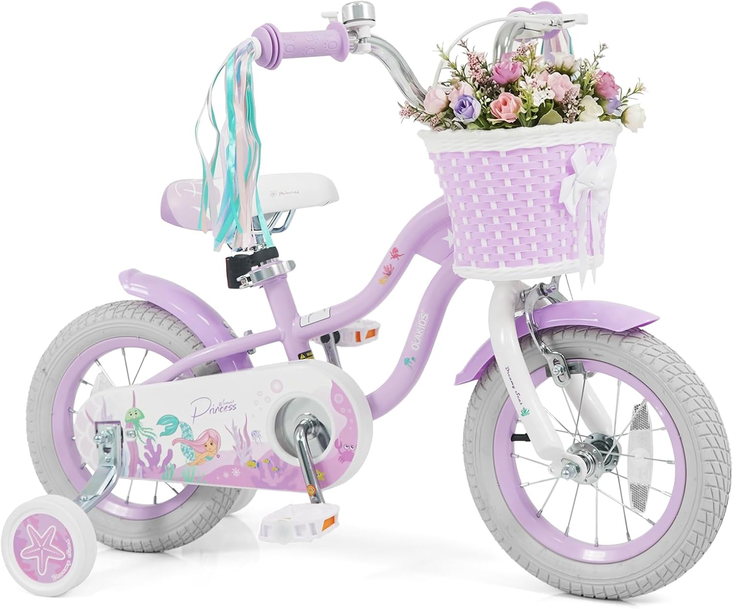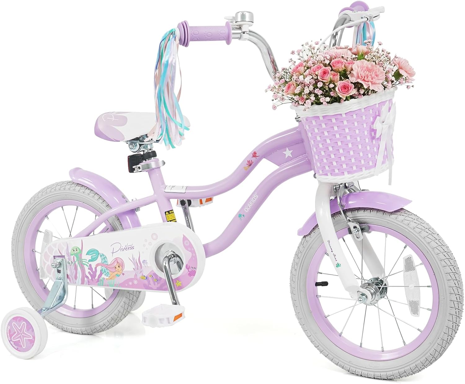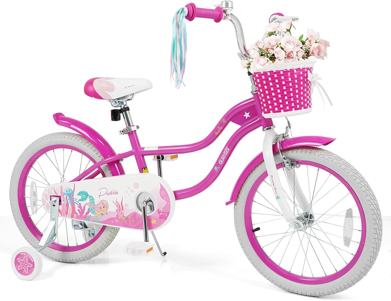 Description: Introducing OLAKIDS mermaid-themed bicycle for kids specially crafted for your little princess! Adorned with dreamy mermaid accents and flowing streamers that dance in the wind, every detail is designed to capture her heart at first sight. The adorable front basket perfectly blends cuteness with functionality, making it a delightful addition to the ride. More than just a pretty look, this toddler bike with training wheels grows right alongside your children. Suitable for kids over 3 years old. Safety is our top priority too. Built to last with a high-quality carbon steel frame, this girl bikes offers unbeatable sturdiness and support for all kinds of adventures. The 18’’ and 20’’ bike is equipped with kickstands to meet parking needs. To make things even easier, this bike arrives 85% pre-assembled, allowing for quick and hassle-free setup that saves parents precious time and effort.