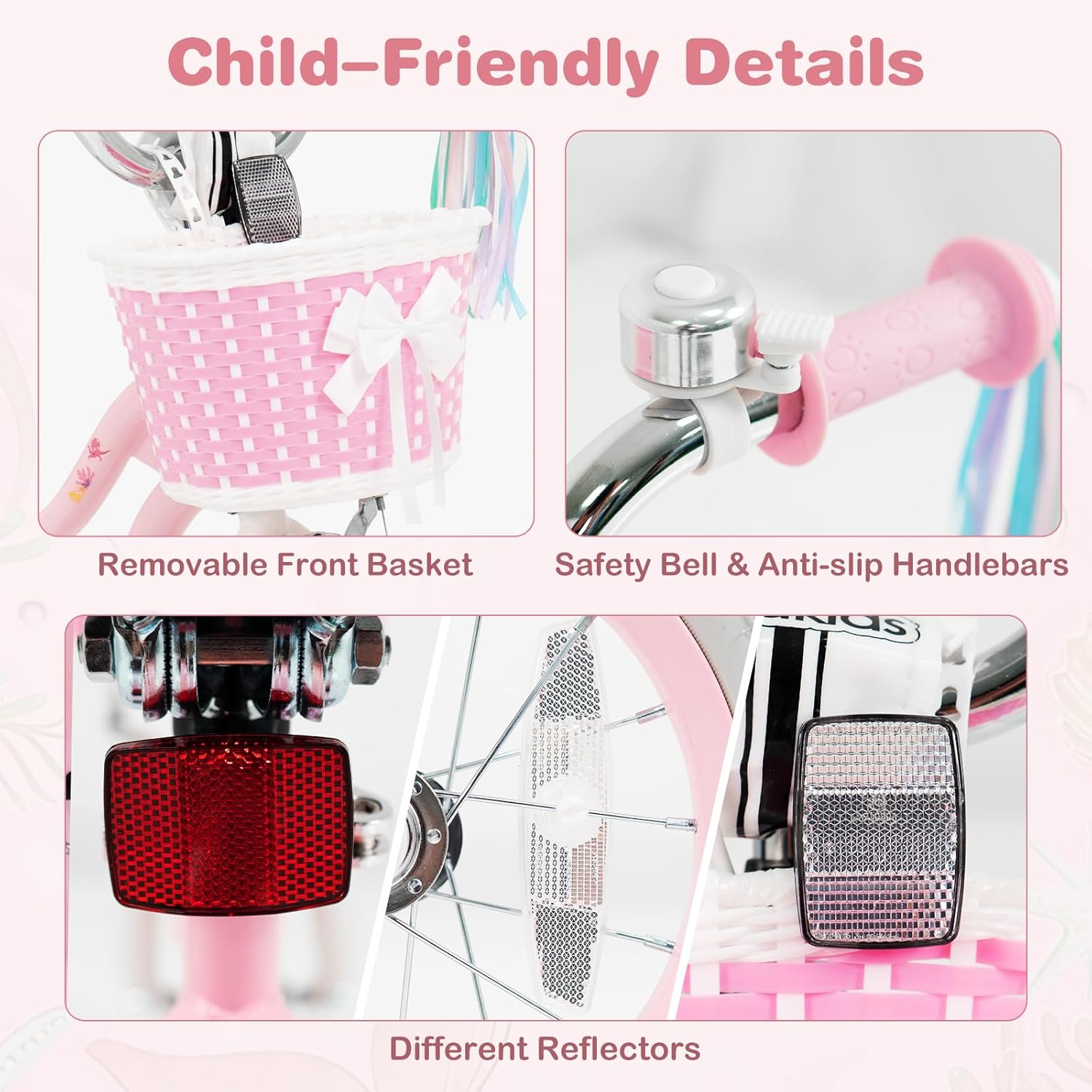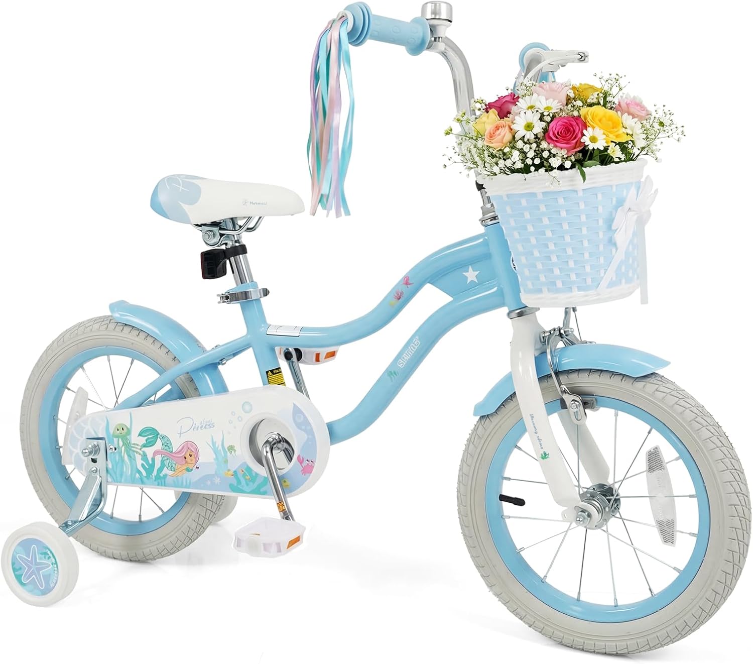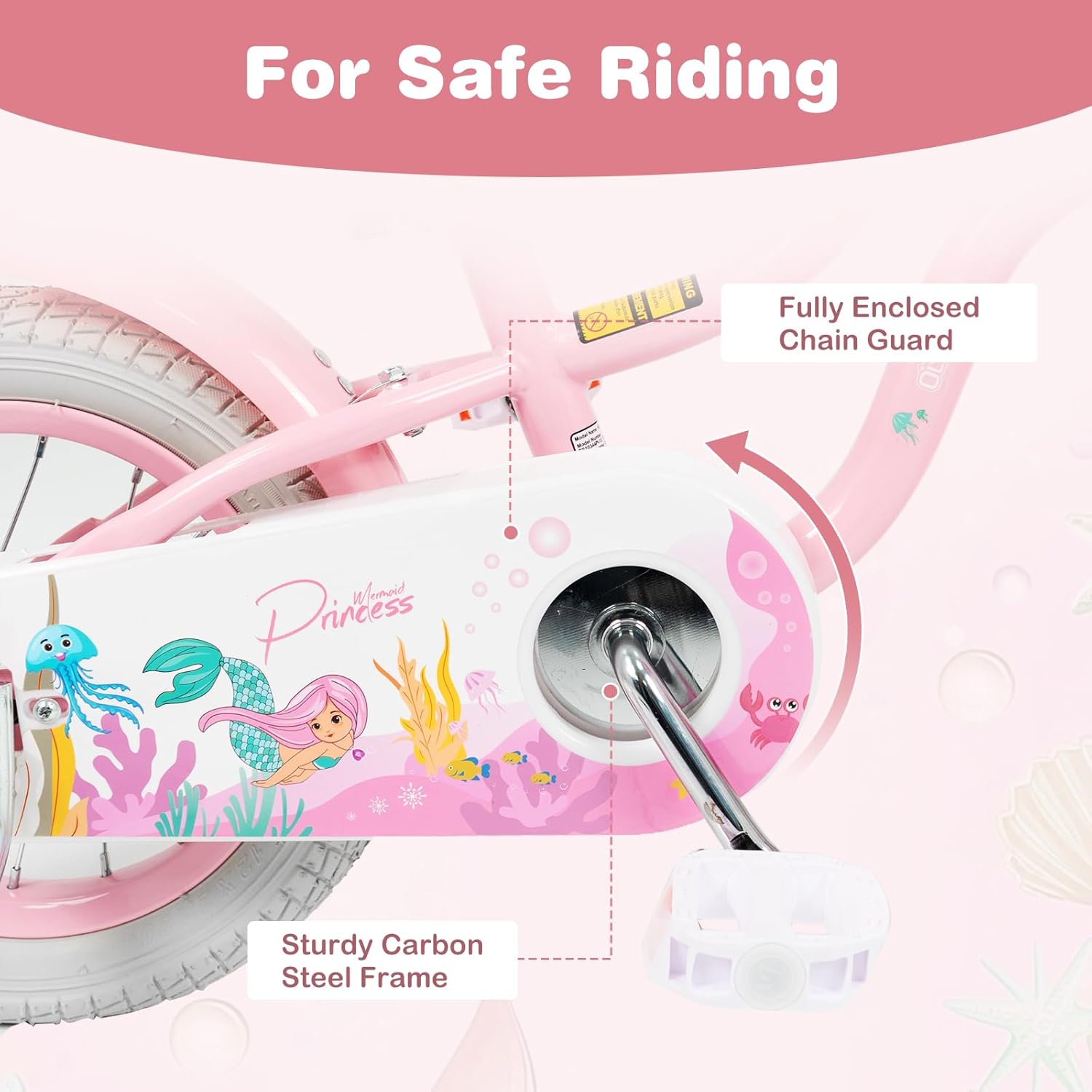 Description: Introducing OLAKIDS mermaid-themed bicycle for kids specially crafted for your little princess! Adorned with dreamy mermaid accents and flowing streamers that dance in the wind, every detail is designed to capture her heart at first sight. The adorable front basket perfectly blends cuteness with functionality, making it a delightful addition to the ride. More than just a pretty look, this toddler bike with training wheels grows right alongside your children. Suitable for kids over 3 years old. Safety is our top priority too. Built to last with a high-quality carbon steel frame, this girl bikes offers unbeatable sturdiness and support for all kinds of adventures. The 18’’ and 20’’ bike is equipped with kickstands to meet parking needs. To make things even easier, this bike arrives 85% pre-assembled, allowing for quick and hassle-free setup that saves parents precious time and effort.