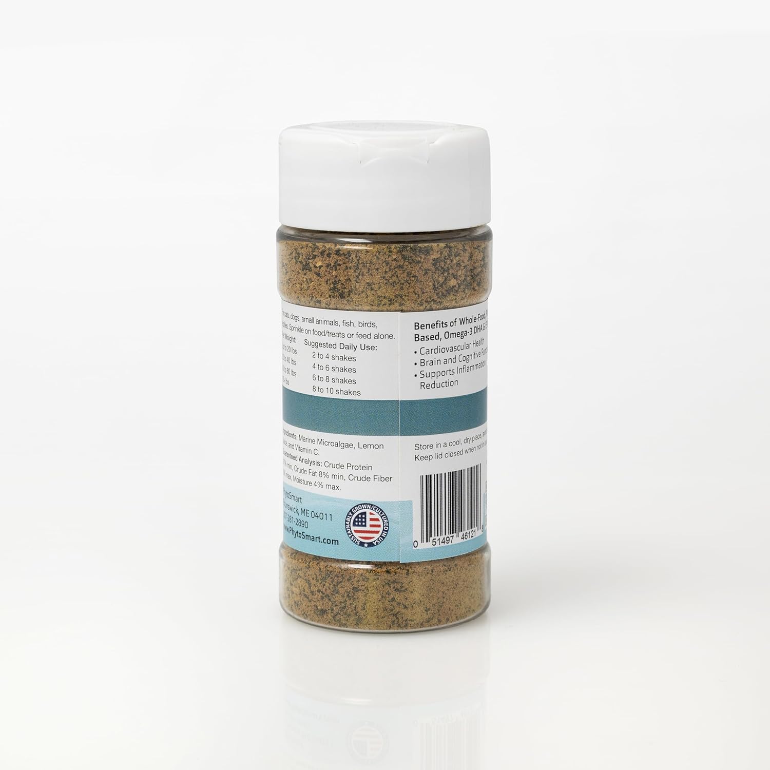 PhytoSmart Omega-3 Krumble for Pets is contaminant-free, unextracted (made from whole-cell micro-algae without the use of heat), and rich in bioavailable omega-3s. We never use heat or chemicals, preserving the integrity of our algae and protecting against oxidation. Unlike fish-derived oils, our vegan, sustainable approach bypasses overfishing and supports healthier ecosystems. -Marine microalgae are the original source of omega-3 fatty acids, producing essential nutrients and natural antioxidants that protect against harmful free radicals. With PhytoSmart Krumble, you get stable, whole-food omega-3 nutrition—without the fish, without the oil! The 100-gram shaker top jar is perfect for convenient portioning—sprinkle it directly onto food or scoop it out with a spoon to serve on its own if you have a picky pet or a pet that doesnt like stuff added to their foods. PhytoSmart Omega-3 Krumble EPA and DHA is a lightweight, shelf-stable dried flake that doesn’t require refrigeration, making it easy to store in a cool dry location like your pantry. Packed with nutrient-dense, bioavailable omega-3’s, KRUMBLE EPA and DHA provides a mess- free, hassle-free alternative to traditional extracted omega-3 oils, eliminating the risk of oxidation. What’s the Difference Between DHA and EPA? DHA (Docosahexaenoic Acid) – Essential for brain, eye, and cognitive health, reduces inflammation, promotes skin and coat health. EPA (Eicosapentaenoic Acid) – Reduces inflammation, supports joints, and promotes heart health. PhytoSmart's Algae-based Omega-3 EPA and DHA combination naturally contains high DHA with EPA benefits.