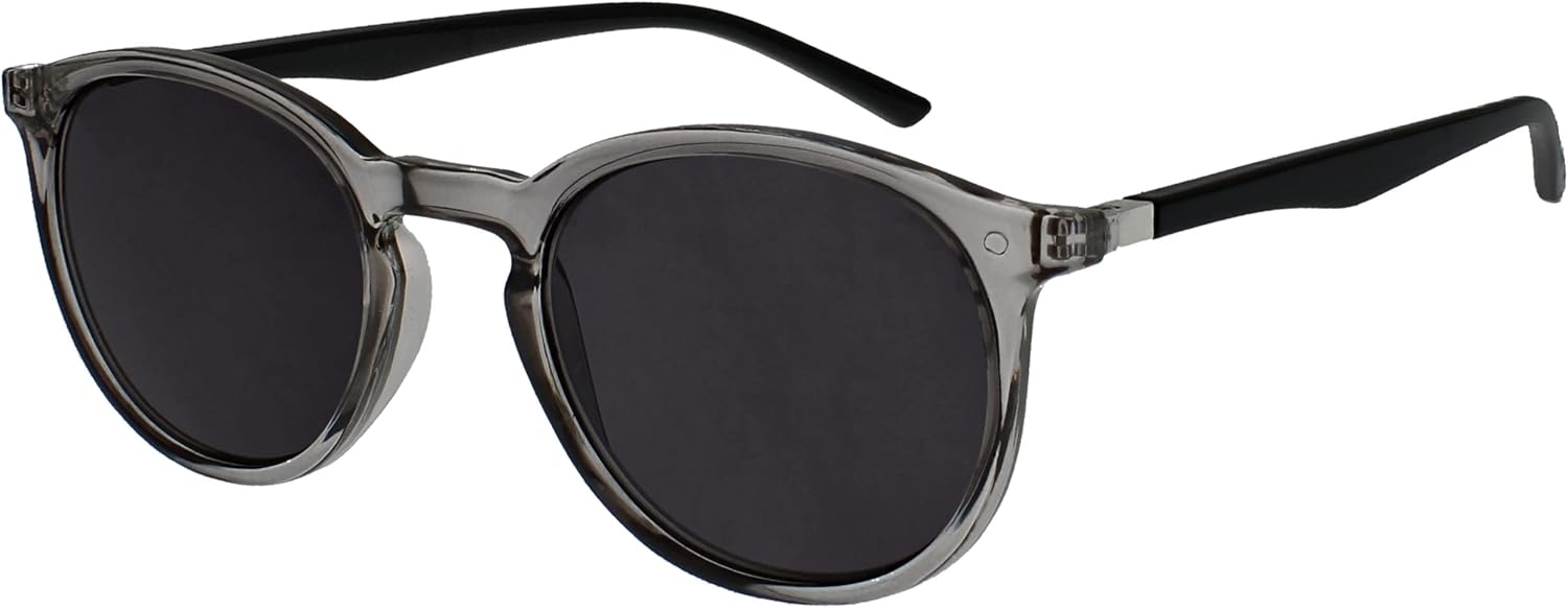Super stylish large size men's/ women's/ unisex sun distance glasses for myopia/ near sightedness. UV400 protection. Blocks UVA and UVB rays. Sturdy round frame design with spring hinges. Easy to clean. Scratch-resistant. Comfort fit. Includes FREE designer style pouch. Clear grey front with black arms. Grey tint lens. Strength -1.50.