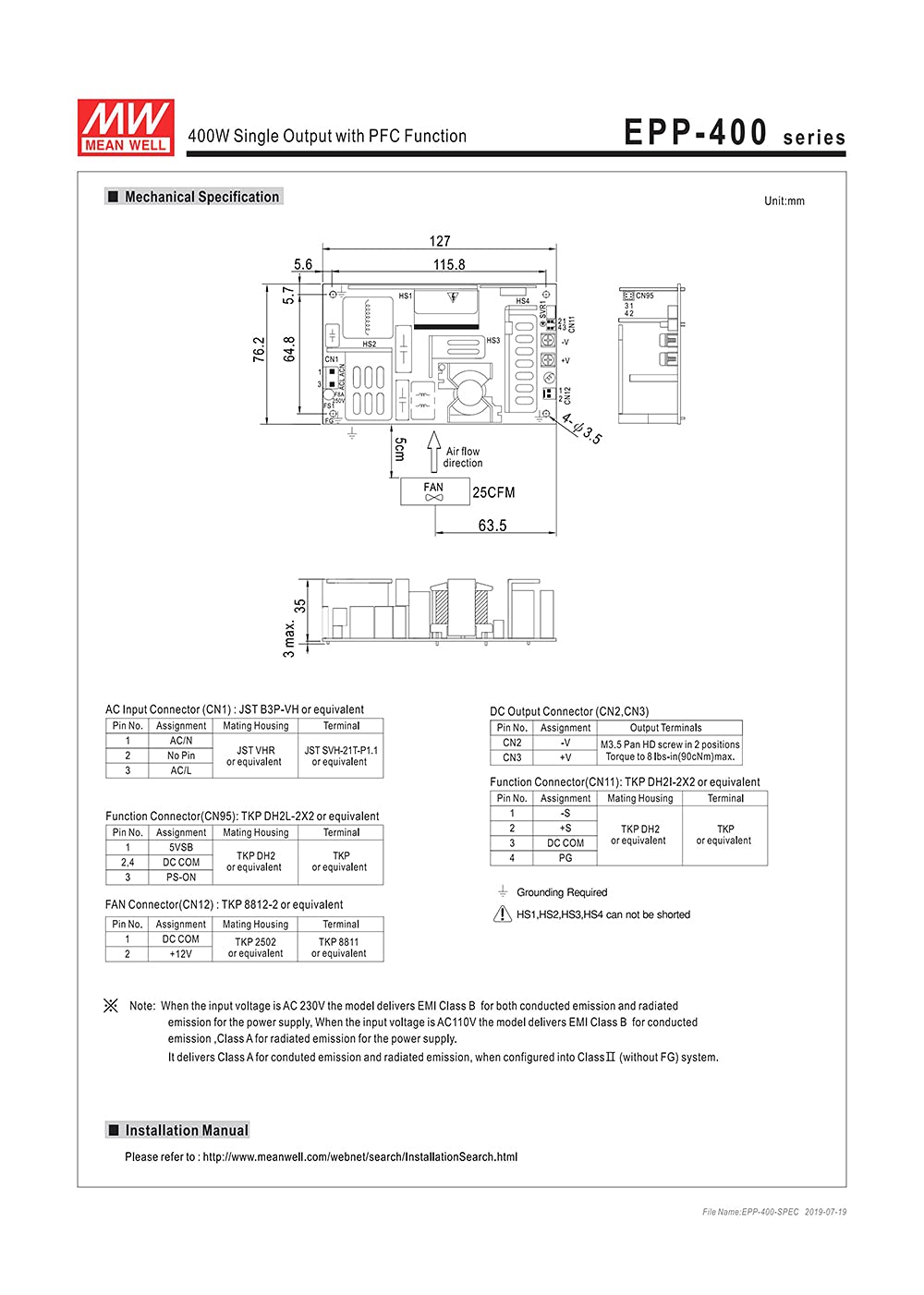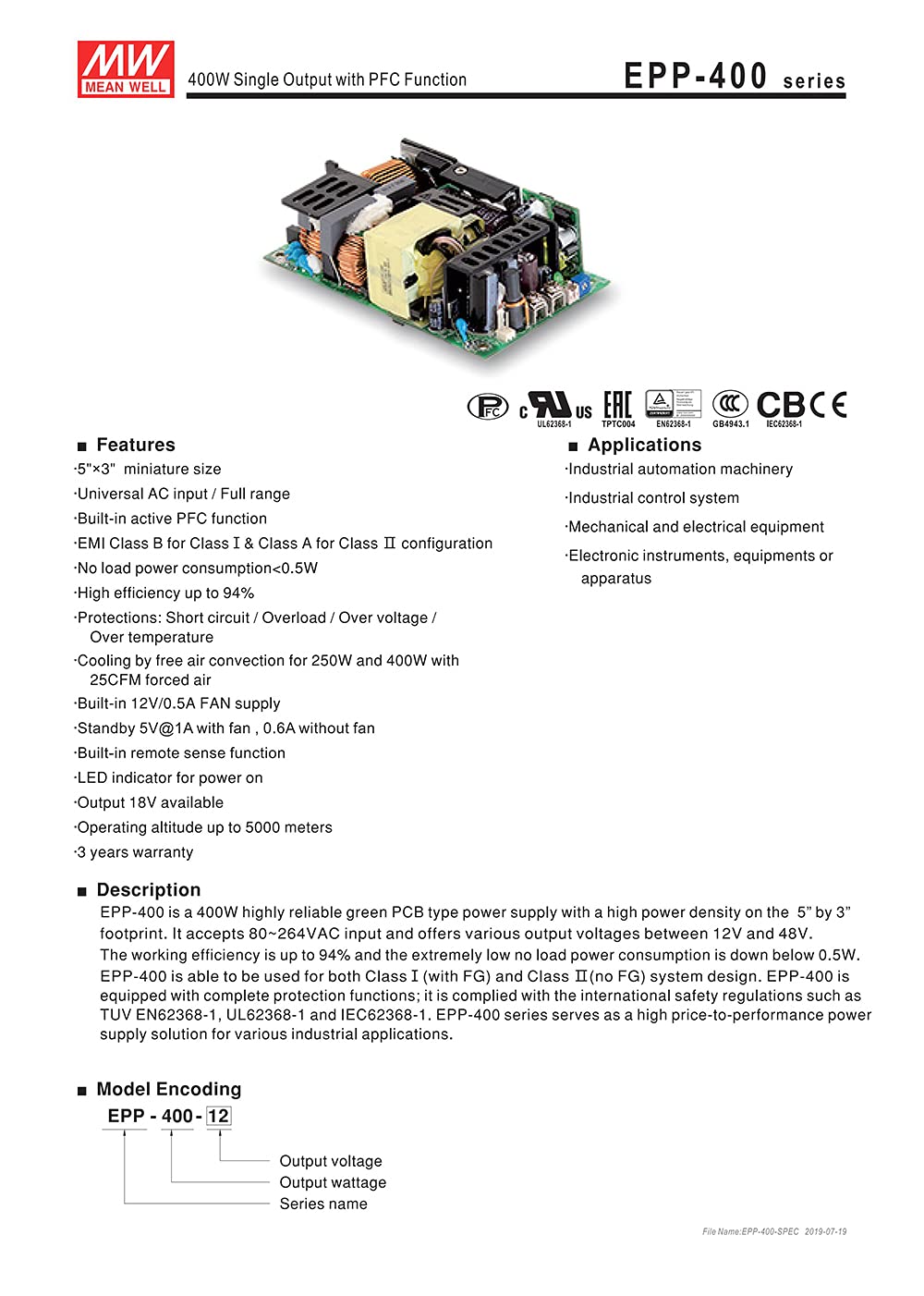 Features5”x 3”compact sizeFull range 80~264VAC input with built-in PFC functionEMI Class B for Class I &Class A for Class II configurationNo load power consumption <0.5WHigh efficiency up to 94%Protections: short circuit/overload/over voltage/over temperatureCooling by free air convection for 250W and 400W with 25CFM forced airBuilt-in 12V/0.5A FAN supplyStandby 5V@1A with fan, 0.6A without fanBuilt-in remote sense functionLED indicator for power onOperating altitude up to 5000 meters3 years warrantyDescriptionEPP-400 is a 400W highly reliable green PCB type power supply with a high power density on the 5 by 3 footprint. It accepts 80~264VAC input and offers various output voltages between 12V and 48V. The working efficiency is up to 94% and the extremely low no load power consumption is down below 0.5W. EPP-400 is able to be used for both Class I (with FG) and Class II(no FG) system design.EPP-400 is equipped with complete protection functions; it is complied with the international safety regulations such as TUV EN62368-1, UL62368-1 and IEC62368-1. EPP-400 series serves as a high price-to-performance power supply solution for various industrial applications.