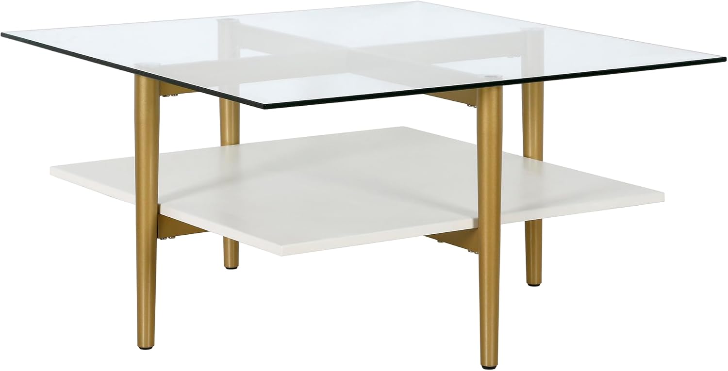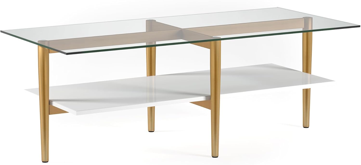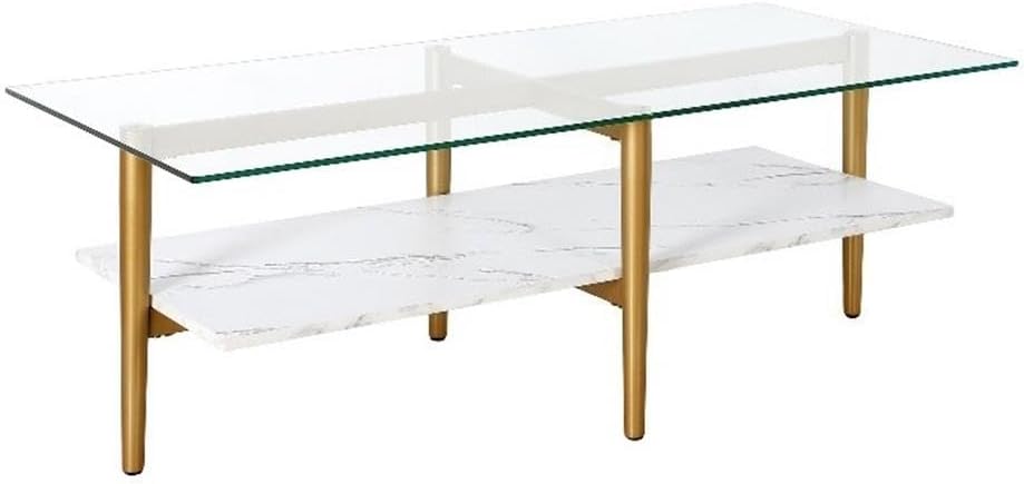 This mid-century inspired coffee table is the perfect pick for your living room or den ensemble. Its base features four tapered legs connected at the center. The top is a transparent tempered glass which shows off the architectural connection and carries the rectangular design through the frame. The lower shelf is finished in faux Carrara-style marble, playing off the tempered glass in size and shape.