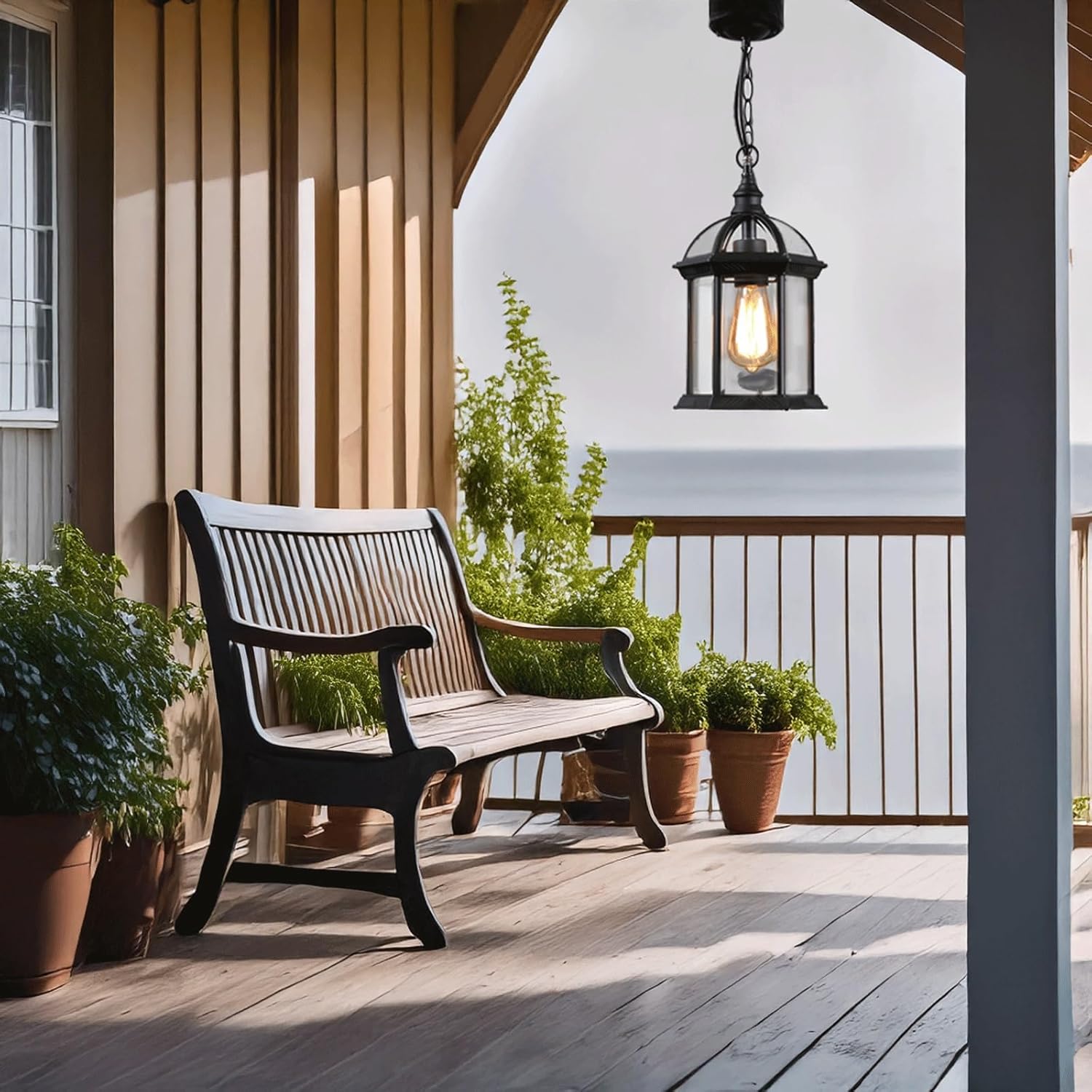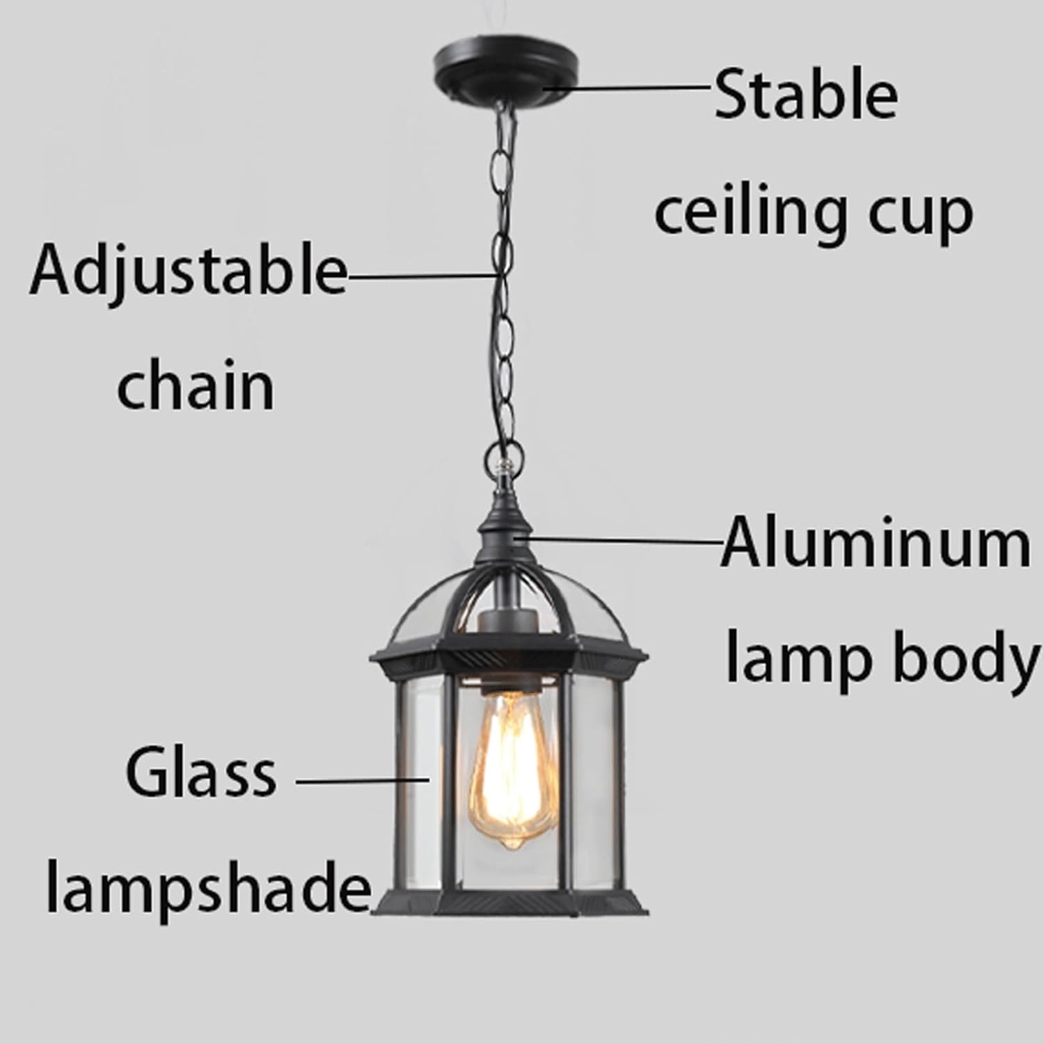 Type: Outdoor Pendant Light / Hanging Lantern / Exterior ChandelierStyle: Vintage, Industrial, Traditional, Farmhouse, RusticMaterial: Aluminum (Fixture), Glass (Shade), Iron (Chain)Color: Black or BrassDimensions:Lampshade Diameter: 7.87" (20cm)Total Fixture Height (excluding chain): 13.78" (35cm)Ceiling Canopy Diameter: 4.33" (11cm)Adjustable Chain Length: Up to 19.69" (50cm), can be shortened to desired lengthSocket type: E27Number of bulbs: 1Bulb included: NoSpecial Feature: Die-cast aluminum body with thickened material for outdoor waterproof and anti-rust performance. Features a stable and sturdy ceiling plate with strong load-bearing capacity. Anti-rust iron chain with adjustable buckle allows for length arrangement. High-transparency clear glass shade is aesthetically pleasing and grand. Spray paint and polishing finish.Applicable Space: Perfect for Villa Courtyard, Outdoor Balcony, Patio, Porch, Gazebo, Pergola, Entryway, Corridor, Aisle, Community Areas, Doorways, and other Outdoor Engineering Projects.