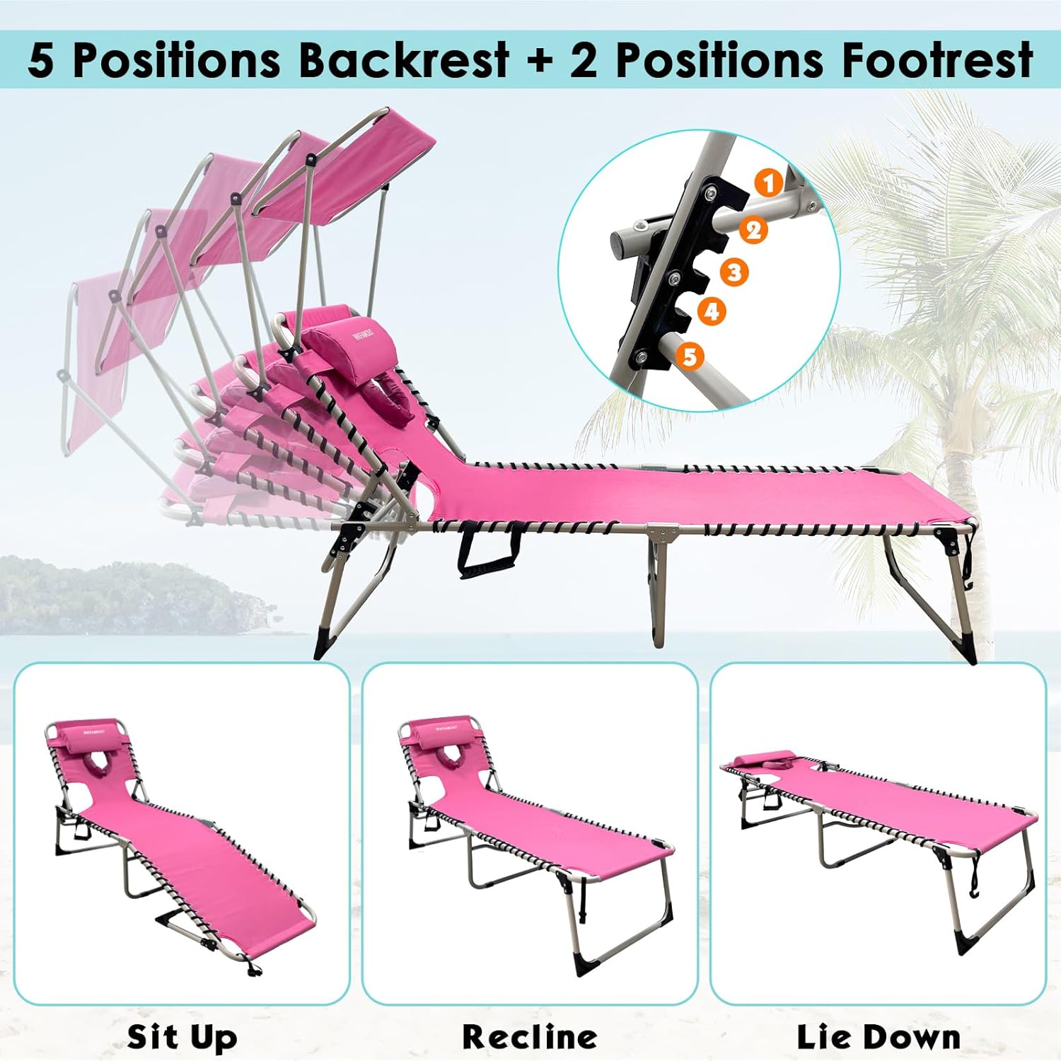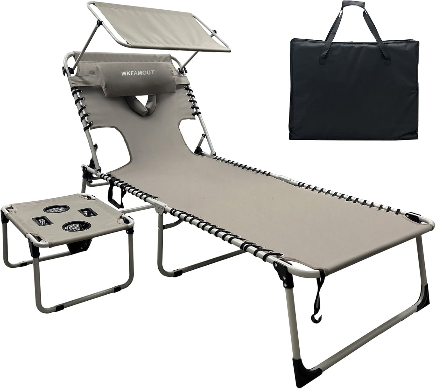Relax in Shade or Sun with Our All-in-One Portable Sun Lounger! Our sun lounger is designed for ultimate comfort and convenience, whether you're soaking up the sun at the beach, lounging by the pool, or enjoying a quiet afternoon in your garden. Comfort:Adjust the 5-position headrest and 2-position footrest to find your perfect angle. The unique face hole and arm holes allow you to lie comfortably face-down, perfect for even back tanning, reading, or simply relaxing without neck strain. Sturdy: The strong steel tube frame and durable 600D Oxford fabric ensure sturdy support for users up to 265 lbs (120 kg). Hassle-Free Setup: The main lounger unfolds with no assembly required. Setting up the canopy is simple and requires no tools—all necessary parts are included. Storage: When done, it quickly folds down to a compact size and fits into the carry bag, making storage and transportation a breeze. Detachable Canopy: Provides adjustable shade when the sun is at its peak. Folding Side Table: Keeps your essentials within arm's reach with two built-in cup holders and two dedicated phone slots. Removable Pillow: Offers extra support and comfort for your head and neck. Carry Bag: Makes transportation and storage neat and hassle-free. Product Size: 74.8 x 23.23 x 14.57 IN Folded Size: 30 x 23.23 x 5.5 IN Table Size: 20.08 x 15.75 x 10.63 IN Canopy Size: 19.68 x 15.74 IN Weight: 8.25 kg (18.2 lbs) Max Load Capacity: 120 kg (265 lbs) Fabric Material: 600D Oxford Frame Material: Steel tube Color: Grey Khaki Pink Blue What's in the Box: 1 x Sun Lounger, 1 x Detachable Canopy (with parts), 1 x Folding Side Table, 1 x Removable Pillow, 1 x Carry Bag