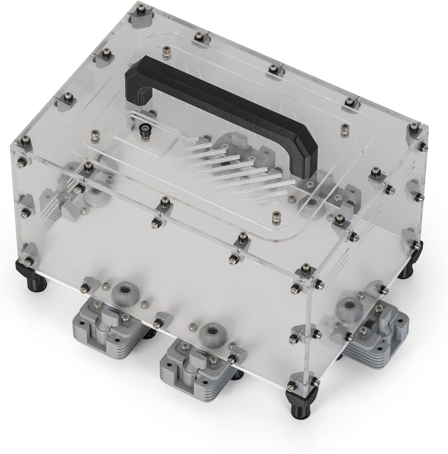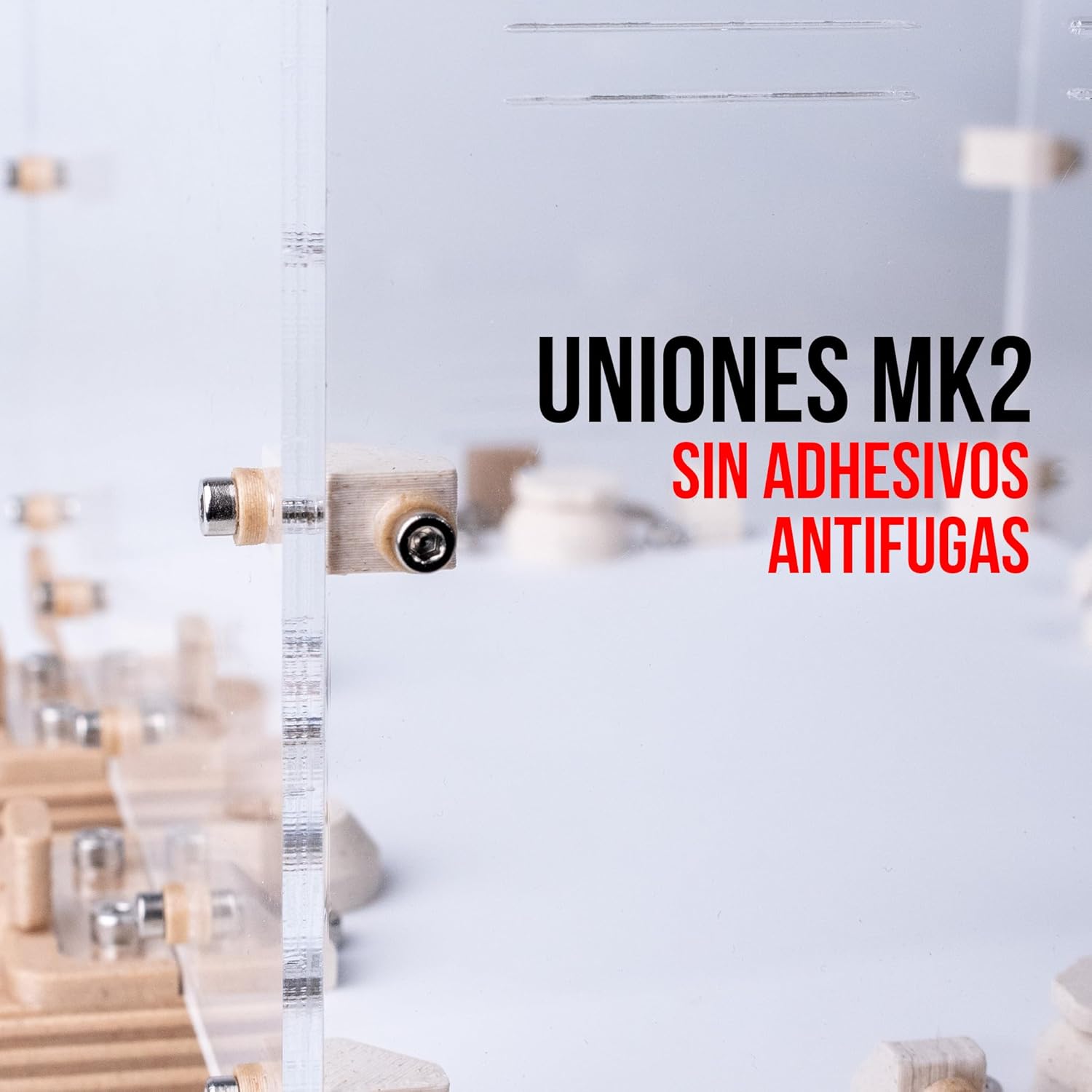 The MK2 2:1 Foraging is a modular foraging box designed to expand the exploration and feeding space of your ant colony. With six strategically located connections, it allows easy integration with anthills and other expansion modules, offering flexibility in habitat design. Its structure is made without adhesives, which facilitates complete disassembly for thorough cleaning and durability. It features a double perspex plate lid for strength and durability, plus a feeding lid that allows food to be introduced without disturbing ant activity. Its design incorporates a mound in the connection area to prevent substrate falling and maintain a cleaner, more natural environment. To ensure proper air exchange, it has side walls with ventilation slots. In addition, its base includes anti-vibration and non-slip feet, providing stability and reducing colony stress. The connections are equipped with rotary dampers that facilitate the connection and disconnection of modules according to the needs of the user. The top fixed lid allows for the application of anti-leak liquid, while the perspex joints use a rail system that maximizes safety and minimizes the risk of leakage. Delivered flat packed, but assembly is simple thanks to the instructions provided with a QR code. Interior dimensions: 21 x 14.5 x 11 cm External dimensions: 26.5 x 19.8 x 18 cm Compatible with ByFormica drinkers: Micro, Mini, Mini Color and Mega Comes assembled: No