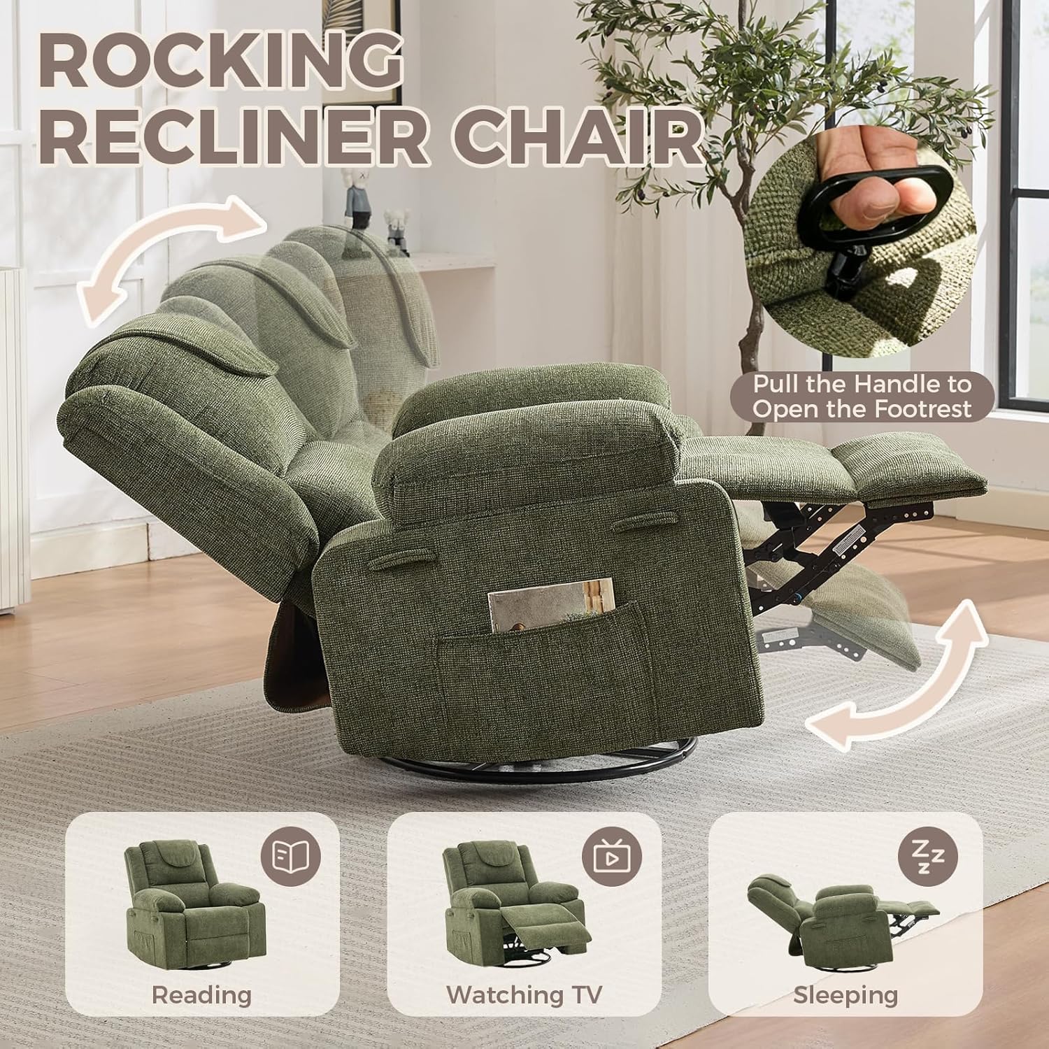 This oversized recliner is designed for everyday comfort, featuring a wide, supportive seat suitable for reading, watching TV, or relaxing. It offers a 360° swivel base and a backrest that reclines up to 150°, allowing flexible positioning for sitting or resting. Built with a durable Q235 carbon steel frame, the chair provides stable support for regular use. The recliner includes 8 vibration massage points covering the back, waist, thighs, and legs, along with gentle lumbar heating to enhance relaxation. Its ergonomic shape follows natural body contours, and the clean, neutral design makes it suitable for living rooms, bedrooms, or balconies.