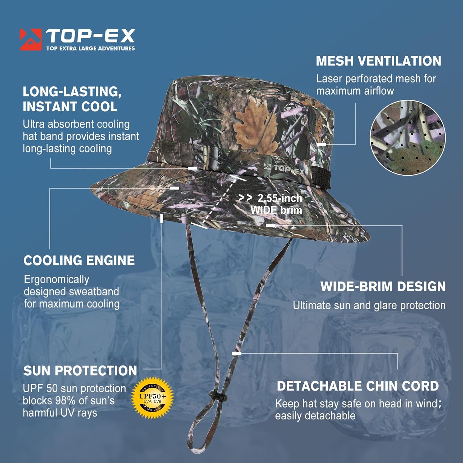 Introducing the TOP-EX Cooling Unisex Sun Hat, your ultimate companion for staying cool and refreshed in any weather condition. With 50% greater cooling power than our original bucket hat, this versatile accessory is perfect for fishing, beach outings, hiking, golfing, or any vacation adventure. Activate the cooling performance fabric in just 3 easy steps: Wet it, Wring it, and Wave it. Experience up to 30 degrees of cooling below average body temperature in under 1 minute, keeping you comfortable for up to 2 hours. The innovative design features laser-perforated mesh panels and a Cool-Touch Cooling Sweatband, maximizing airflow and breathability throughout the day. Never worry about windy conditions with our upgraded windproof chin cord, easily adjustable and detachable for added convenience. Available in sizes M/L (57-60cm), L/XL (61-63cm), and XL/XXL (63-66cm), with an elasticized draw cord for a perfect fit for all head sizes. Crafted from UPF 50+ cooling fabric, this hat blocks 98% of harmful UV rays with a 7.2cm wide brim, providing essential sun protection for your face and neck. Weighing just 79.95g, this lightweight hat is travel-friendly and perfect for all outdoor activities. The soft crown and foam brim ensure easy packing, while the mesh lining and breathable holes enhance airflow. Comfort meets style meets function with the TOP-EX Cooling Sun Hat. Whether on land or in the water, this adventure fitness essential is designed to keep you cool, protected, and looking great wherever your journey takes you.