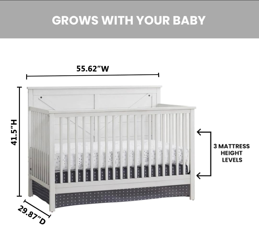 Create a warm and welcoming nursery with the Montauk Collection by Oxford Baby. The Montauk Collection boasts enchanting rustic farmhouse style while maintaining the highest quality and safety standards in the industry. The furniture is constructed from the finest solid woods and veneers which help capture its beautiful design.The Montauk 4-in-1 Convertible Crib features a solid straight line shiplap headboard with barn style cross bar accents and stylish rivets. Crafted with care, the Montauk Crib meets and exceeds all required safety standards. Your baby will rest easy in the familiarity of the Montauk 4-in-1 Convertible Crib as it transitions through the stages of baby’s life into a toddler bed, day bed, and full-size bed.The Montauk Collection by Oxford Baby features: 4-in-1 Convertible Crib, 3-Drawer Dresser, Changing Topper, Toddler Bed Guard Rail, and Full Bed Conversion Kit. All collection pieces are sold individually. Available in beautiful Farmhouse Gray and Barn White finishes.