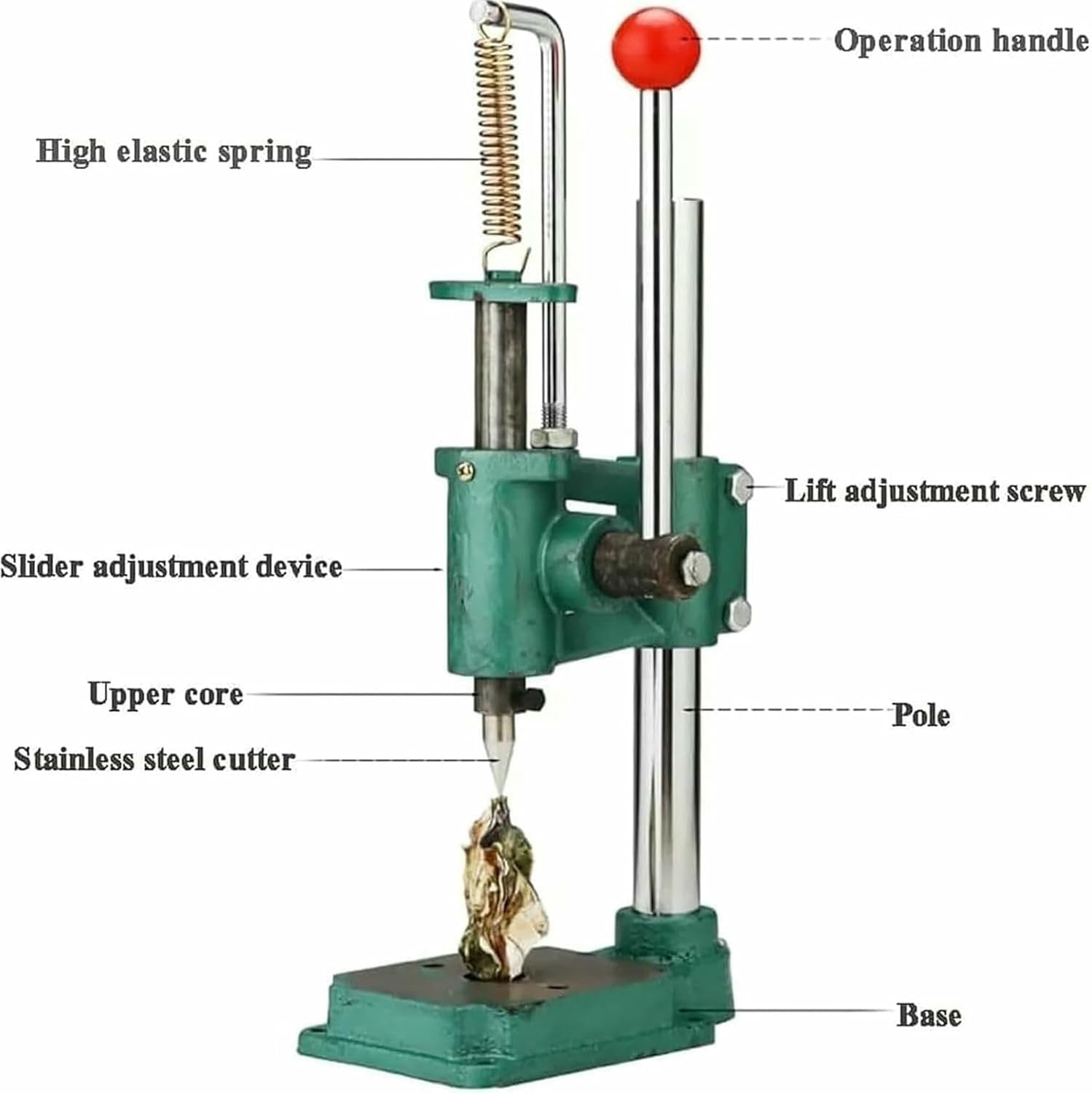 Spec.Name:Oyster ShuckerMaterial:304 stainless steelTip Angle:60° or moreMachine Height:36CMBase length:15CMWidth of base:12CMPanel width:11CMPanel length:13CMThroat depth:10.3CMGDownward stroke:6.1CMGross Weight:5KGMachine Pressure:150KGColour:GreenPackage.Oyster Shucker*1Knife*2Glove*1Hexagonal Wrench*1Open End Wrench*1