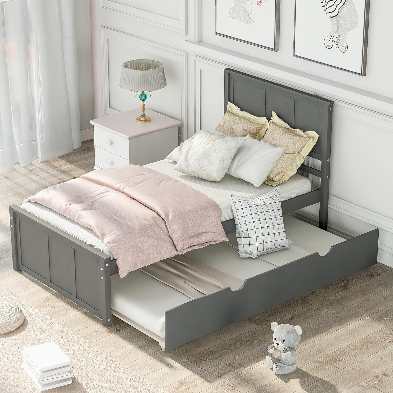P PURLOVE Twin Size Platform Bed with A Trundle, Wood Platform Bed with Twin Size Trundle Bed,Platform Bed Frame with Headboard with Slat Support, No Box Spring NeedThis platform bed will bring a spark of style that's elegant and timeless. The bed is long-lasting with frame made of solid wood and MDF. The space-saving trundle can come in handy for guests, and it slides easily on wheelsSpecification:Material:Pine wood+MDFSize:Twin size platform bedFunction:Platform BedDecoration:With trundleSpring box:No needNumbers of slat(bed):8Numbers of slat(trundle):8Dimensions:Overall Product Dimension:78.98''L*42.7''W*41.3''H(with trundle in)Bed:78.98''x 42.7''Total Height:41.3''Trundle:70.9'' x 39.3''Recommended Mattress Thickness(Platform/Trundle):6"Bed Weight Capability:250lbTrundle Weight Capability:250lbOrigin:Vietnam