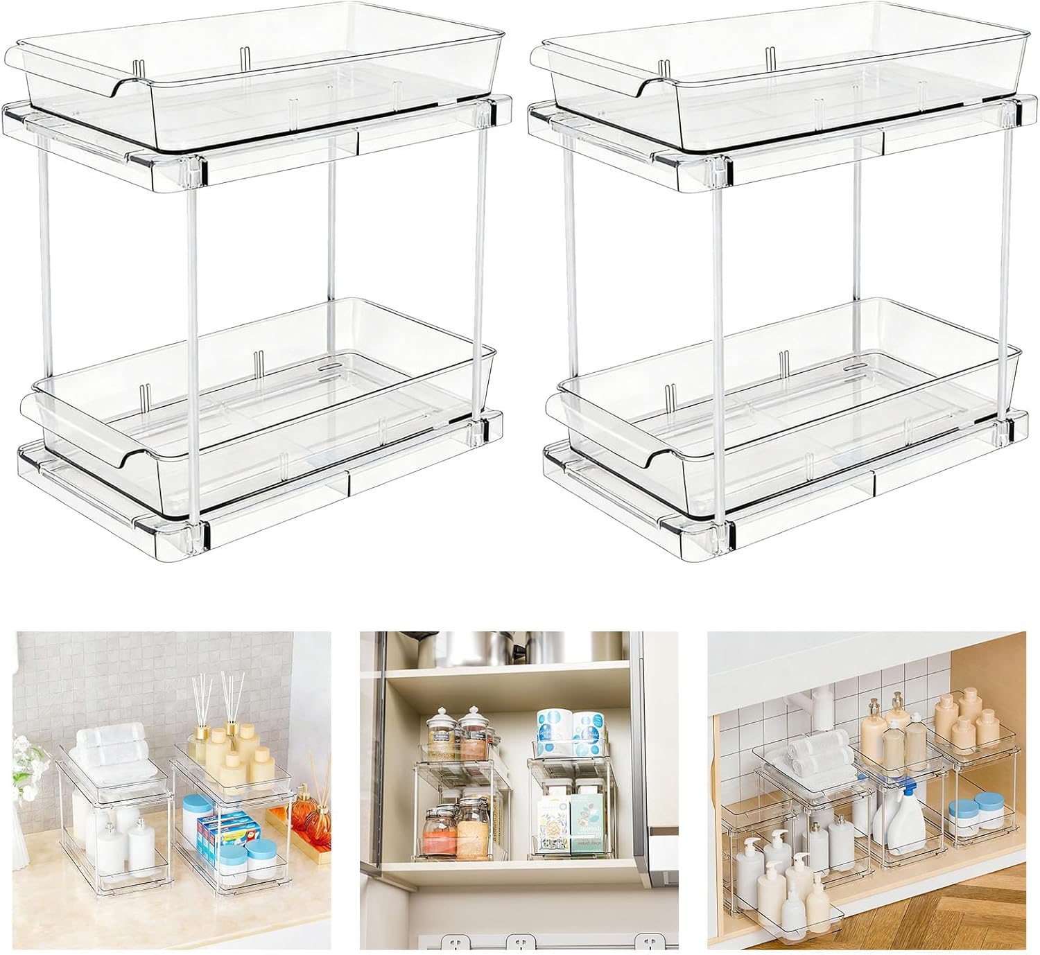 Pack of 2 Space Saving Bathroom Shelf Organizers with Multi Layer Compartments Storage Rack for ProductsFeatures:This pull out bathroom storage rack features a flexible sliding design that adjusts to fit various item sizes, solving the issue of fixed shelves not accommodating objects.Constructed with it multiple tiers for organized storage, is rust light weight yet stable, and ensures easy Ideal for households with multiple members, or pets, this organizers efficiently manages clutter in busy bathrooms.Perfect for maximizing vertical space under sinks, it stores cosmetics, toiletries, bottles, and more, keeping your bathroom tidy and functional.Its robust build and efficient use of space provide long term storage in humid environments.Specifications:Component: Size Approx 12.1x10.6x7.3inchPackage Includes:Bathroom Storage Rack × 2Note:1.Please allow 1-2cm errors due to manual measurement, make sure that you will not mind before you order. 2.Due to the differences between different monitors, the picture may not reflect the actual color about the item.