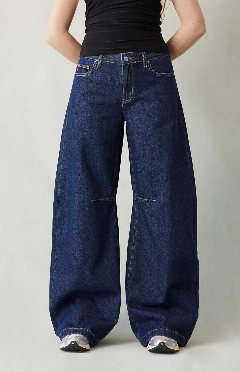 The Remi Baggy Barrel Jeans Knee Dart in Dark Blue from Pacsun are your new go-to for laid-back, on-trend vibes. They feature a mid-rise waist, relaxed baggy fit, barrel-shaped legs, and knee darts for a super flattering look—plus contrast stitching and a dark indigo wash on rigid, sustainably sourced cotton for that eco-friendly touch.Model is wearing a size 26Model measurements: 5'8" height, 30.5" bust, 24.5" waist, 35.5" hipsLearn more about Pacsun eco items Pacsun Women's Remi Baggy Barrel Jeans Knee Dart Dark Blue