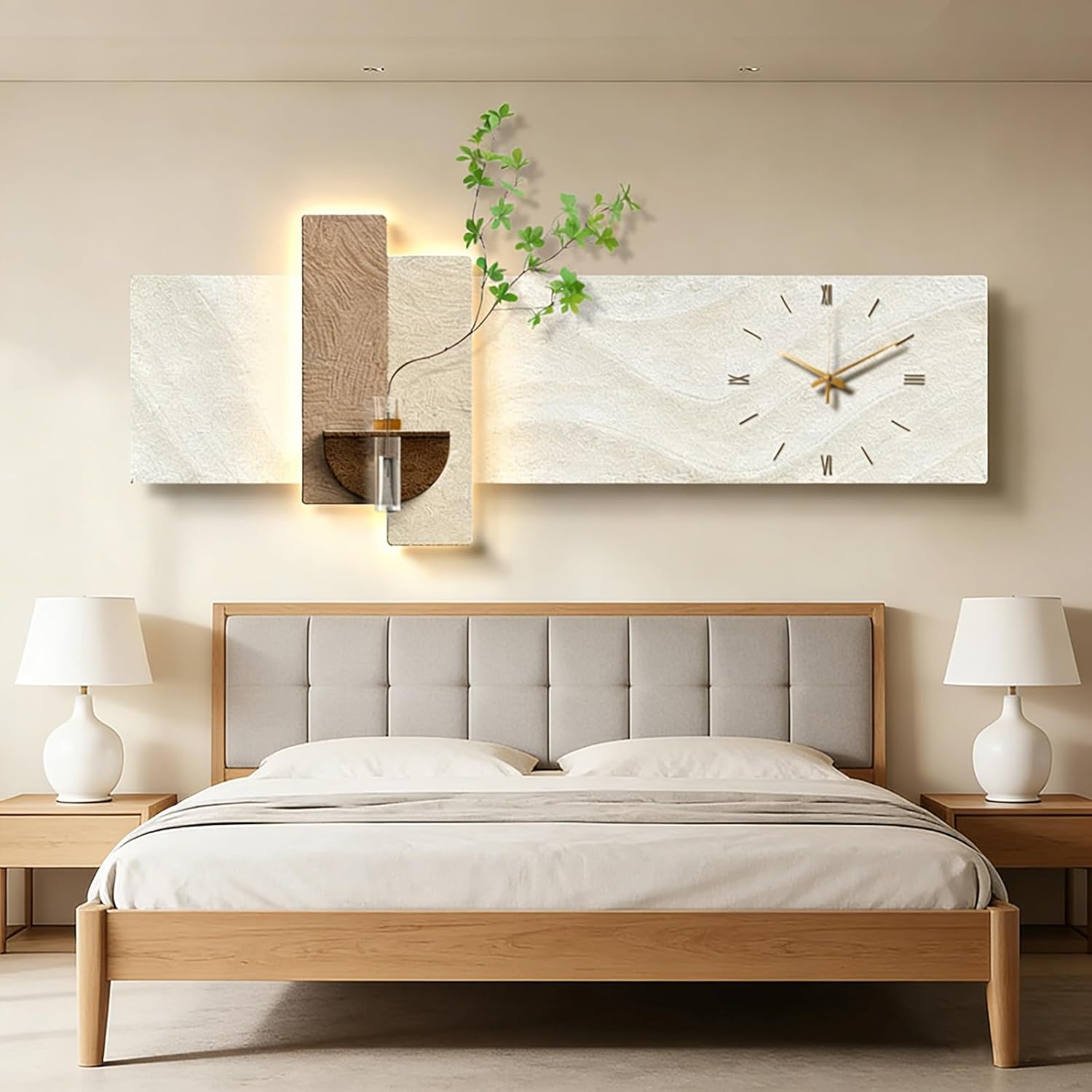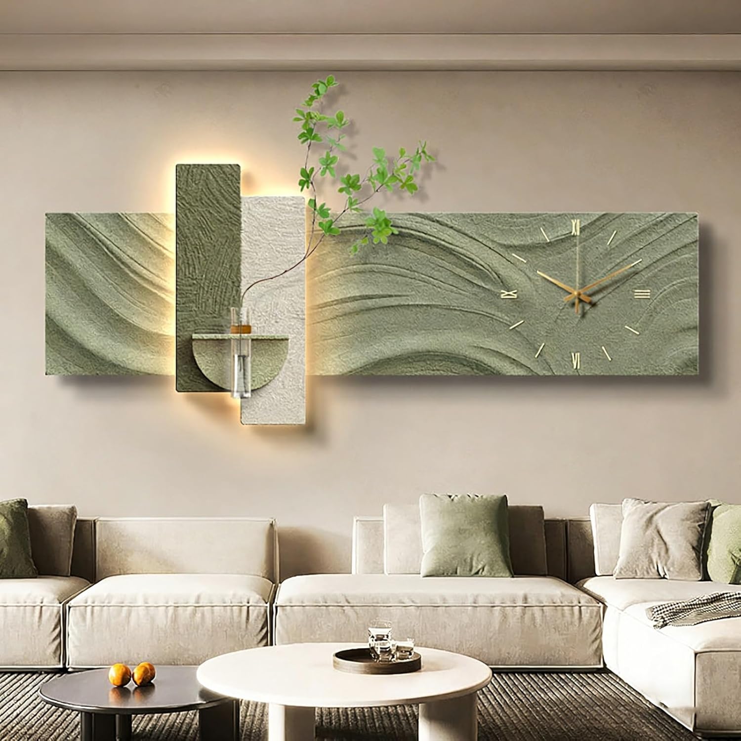 ——Featuring a handcrafted 3D sandstone look, the artwork showcases a realistic textured surface layered with faux greenery and clear glass vases. The thoughtful composition creates depth and visual interest, delivering a sculptural effect that feels organic yet refined, making it a striking focal point on any wall.——More than just a decorative piece, it's a serene and stylish wall clock—simple digital hour markers allow you to easily keep track of time without making noise or causing visual distractions; the concealed LED light (controllable via remote) emits a soft, warm glow.——This sculptural wall decoration is perfect for residential or commercial spaces, adding a touch of sophisticated style to your living room, bedroom, or dining room.【Product Specifications】*Product Name: Modern Decorative Wall Clock*Material: Sandstone, Glass*Size: Multiple sizes available as shown in the picture*Usage: Plug-in*Package List: 1 x Wall Decor Painting, 1 x Vase, 1 x Artificial Green Plant——Note: This product does not include batteries. The clock requires AA batteries. Please prepare your own batteries before installation.
