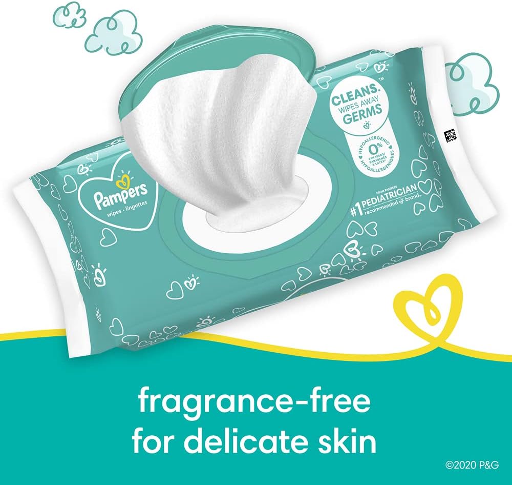 Pampers Complete Clean wipes clean from top to bottoms. A soft touch and durable strength make these versatile wipes tough enough to tackle messy hands and diaper changes, yet gentle enough to clean your baby's delicate face. Unscented for a clean that's dermatologically tested and hypoallergenic, Pampers Complete Clean wipes also do not contain parabens, phenoxyethanol, perfume, alcohol, or dyes.