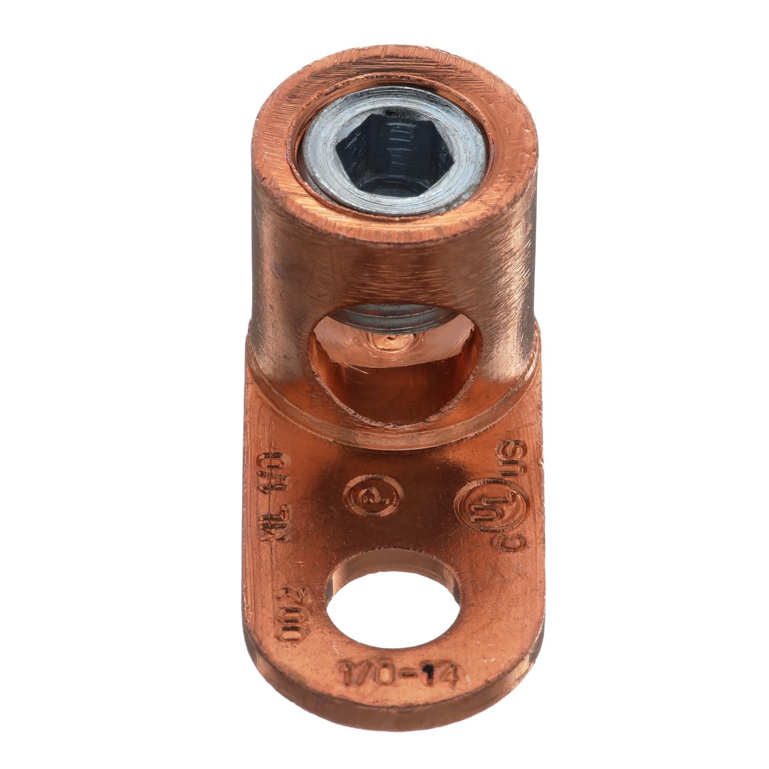 One-hole, copper, single barrel post lug, straight tongue, #14 SOL - 4 STR, 1/4 (6. 4mm) stud hole. Wire range taking, inspection window, high strength copper, compact design, flat for complete surface contact.